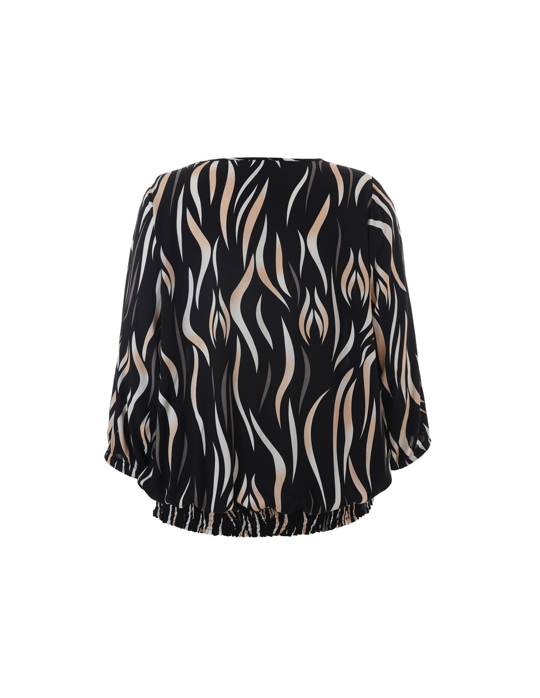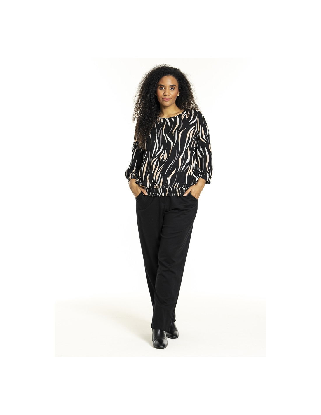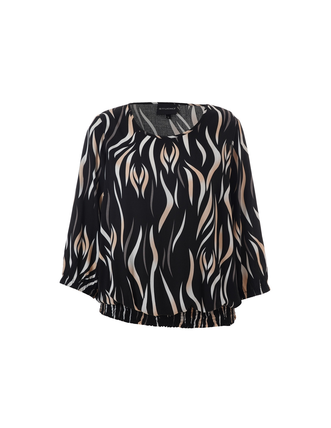 Fin bluse i 100% viskose med hvitt og beige farget trykk på svart bakgrunn. Lange ermer med elastiske mansjetter. Blusen har rund hals og strikk nederst.
