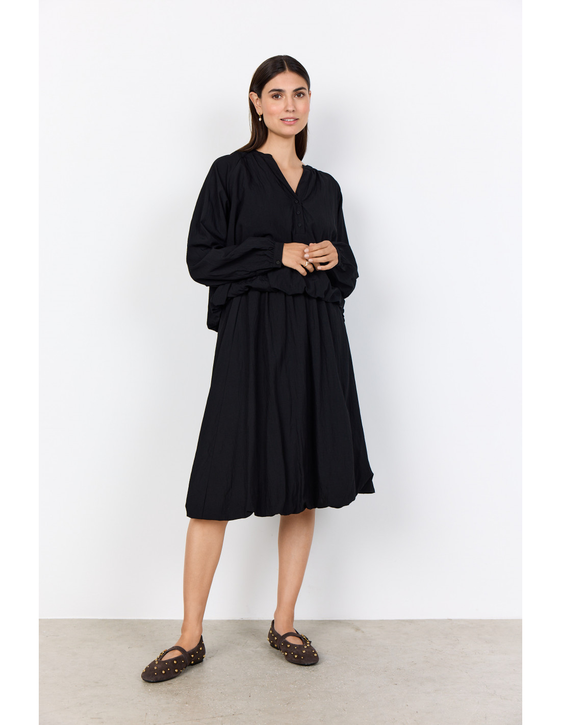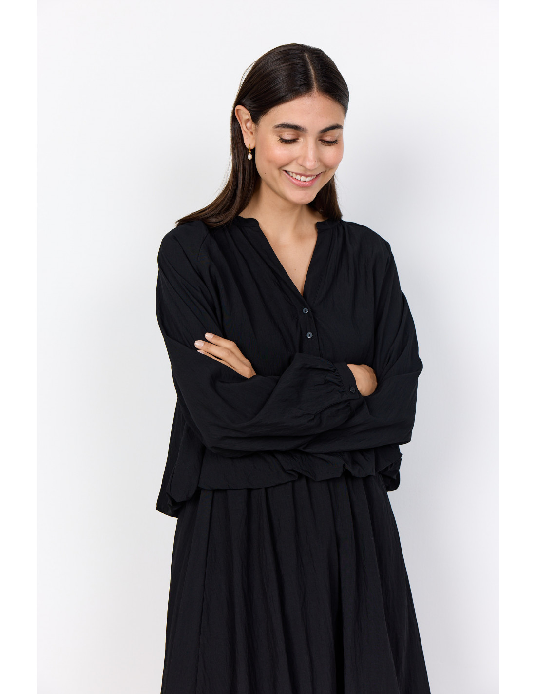 SC-SEVDA 1 Blusen er laget av 71% LENZING™ ECOVERO™ Viskose, 29% Nylon. Denne blusen har en V-hals, knappdetaljer og lange ermer med en avslappet passform. Kombiner den med skjørtet som vist på bildet, eller dressbukser, jeans for forskjellige stiler.