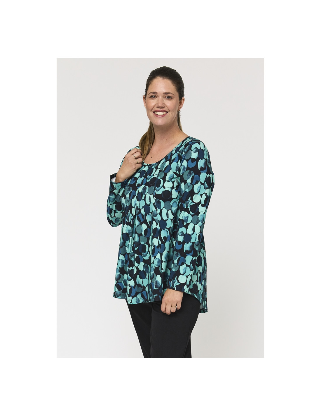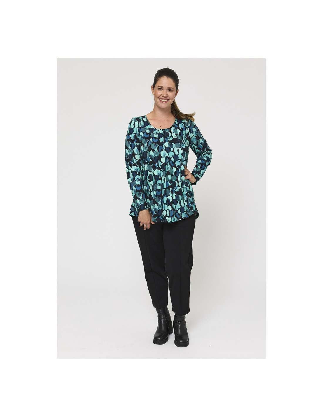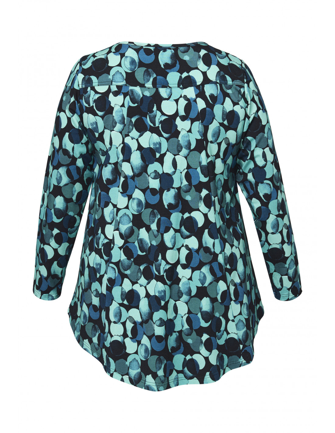 Det grafiske mønsteret i dype grønne/petrol og svarte toner gir denne blusen et dristig og stilig uttrykk. Den A-formede silhuetten faller vakkert og fremhever figuren på en flatterende måte, mens det elastiske viskosestoffet sikrer bevegelsesfrihet og en lett og komfortabel følelse.