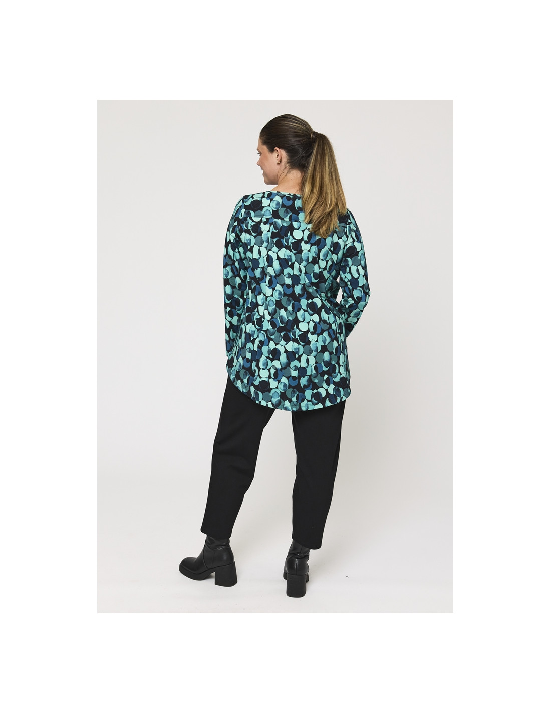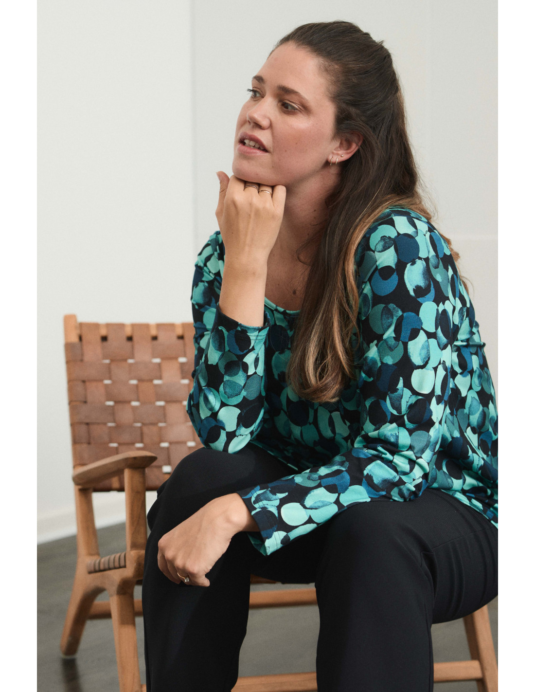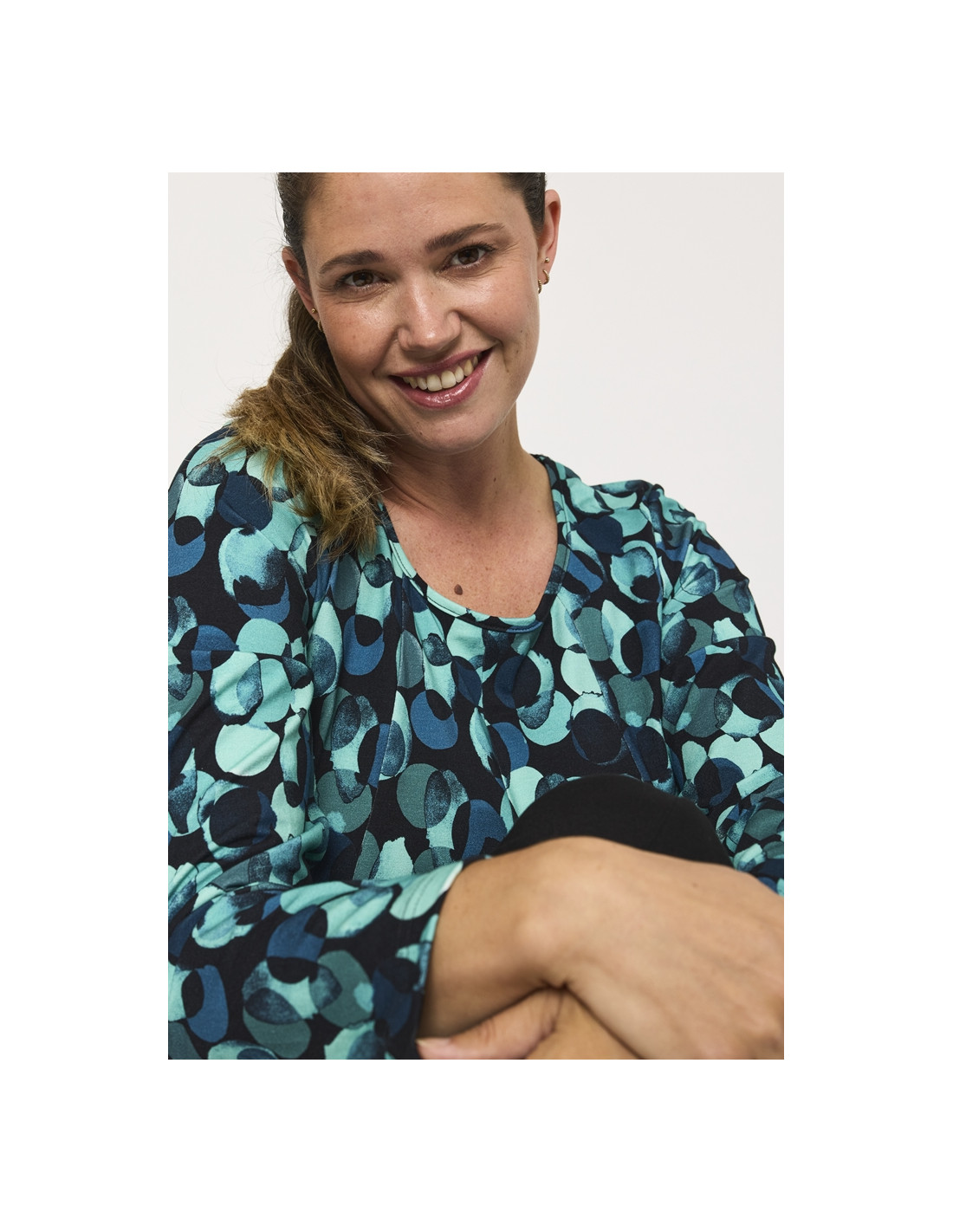 Det grafiske mønsteret i dype grønne/petrol og svarte toner gir denne blusen et dristig og stilig uttrykk. Den A-formede silhuetten faller vakkert og fremhever figuren på en flatterende måte, mens det elastiske viskosestoffet sikrer bevegelsesfrihet og en lett og komfortabel følelse.