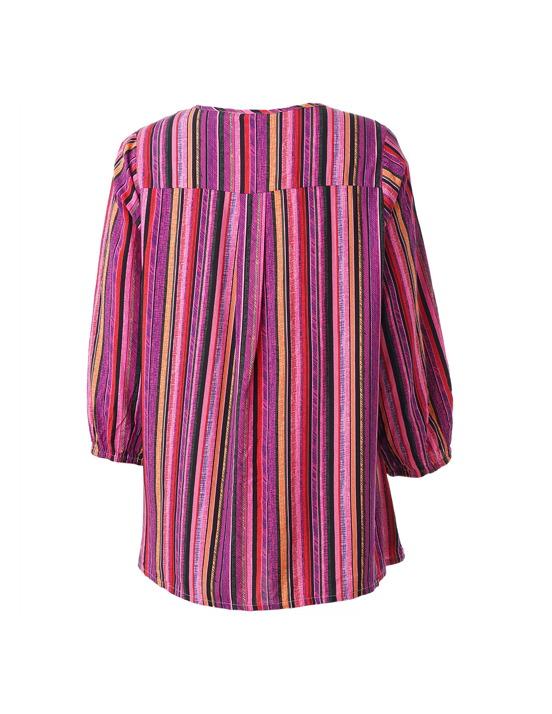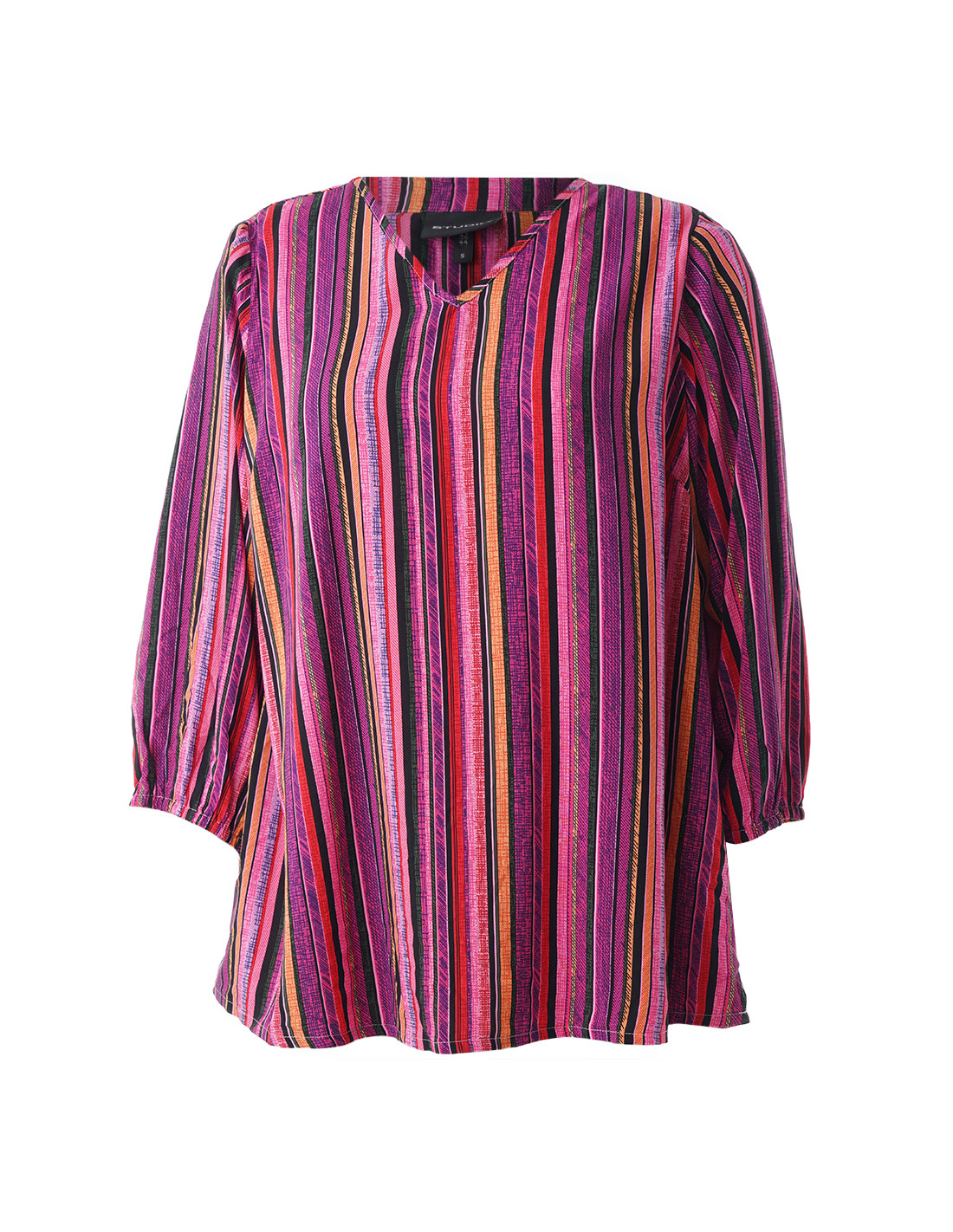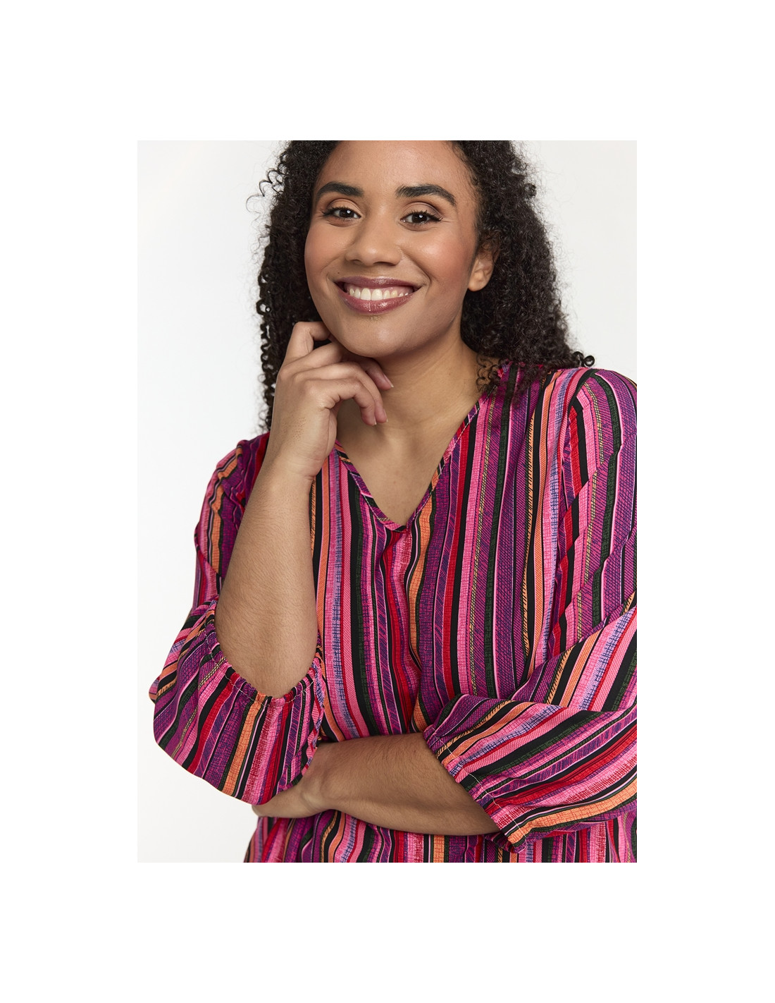 En bluse i 100 % viskose med et dekorativt rosa firkanttrykk i nyanser av rosa og hvitt. Modellen har V-hals som fremhever det feminine uttrykket. De lange ermene er avsluttet med strikk som gir volum og komfort.