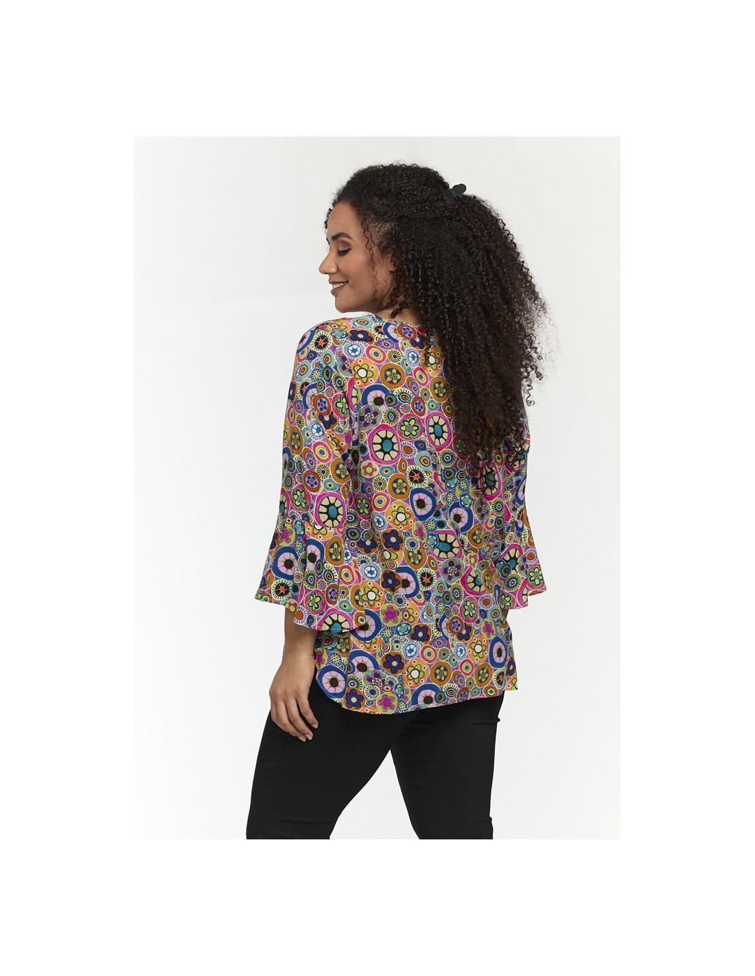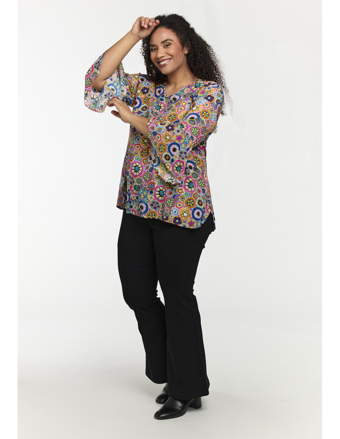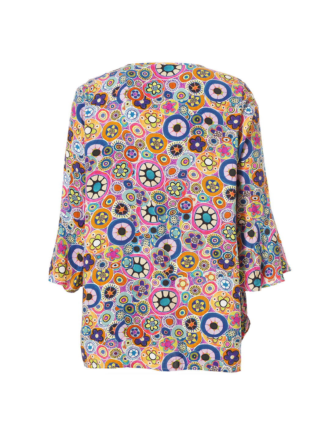 En bluse i 100 % viskose med et fargerikt, sirkulært flerfarget trykk i blå, rosa, grønne og hvite nyanser. Modellen har V-hals og lange ermer. Den løse passformen og det myke materialet gir et avslappet og feminint utseende.