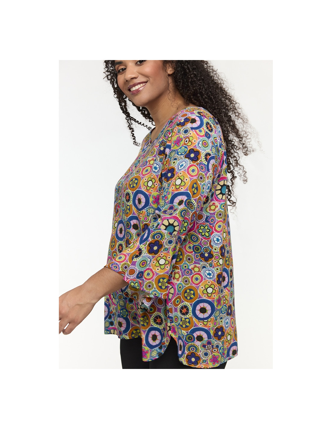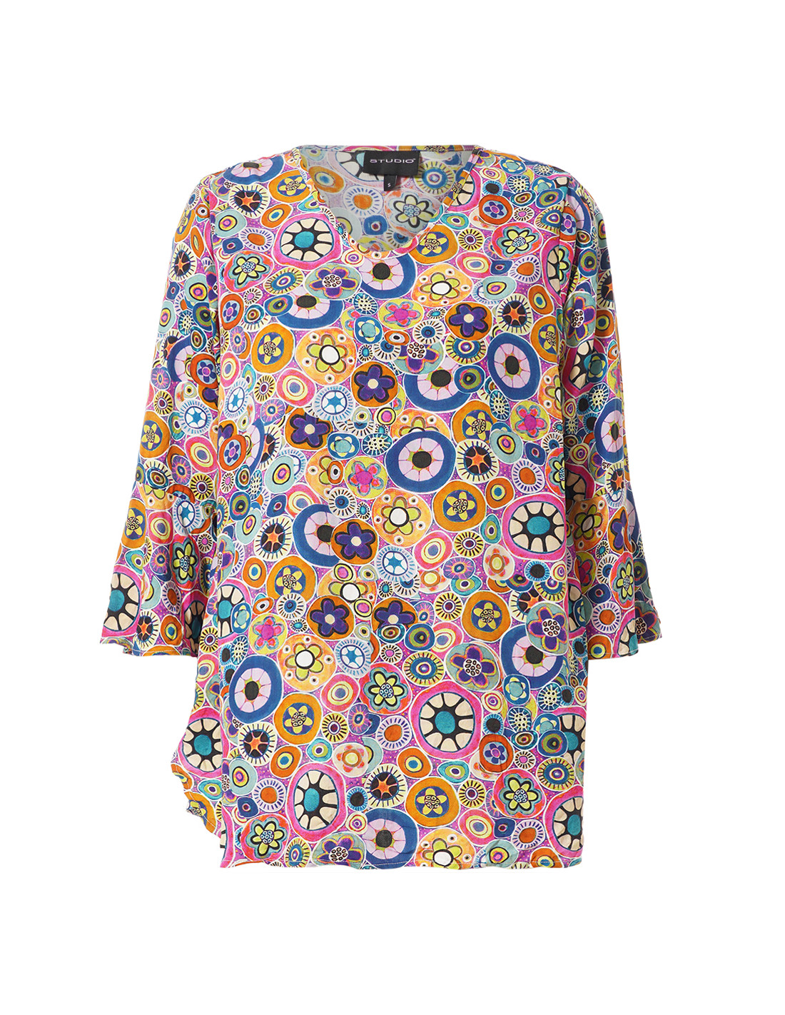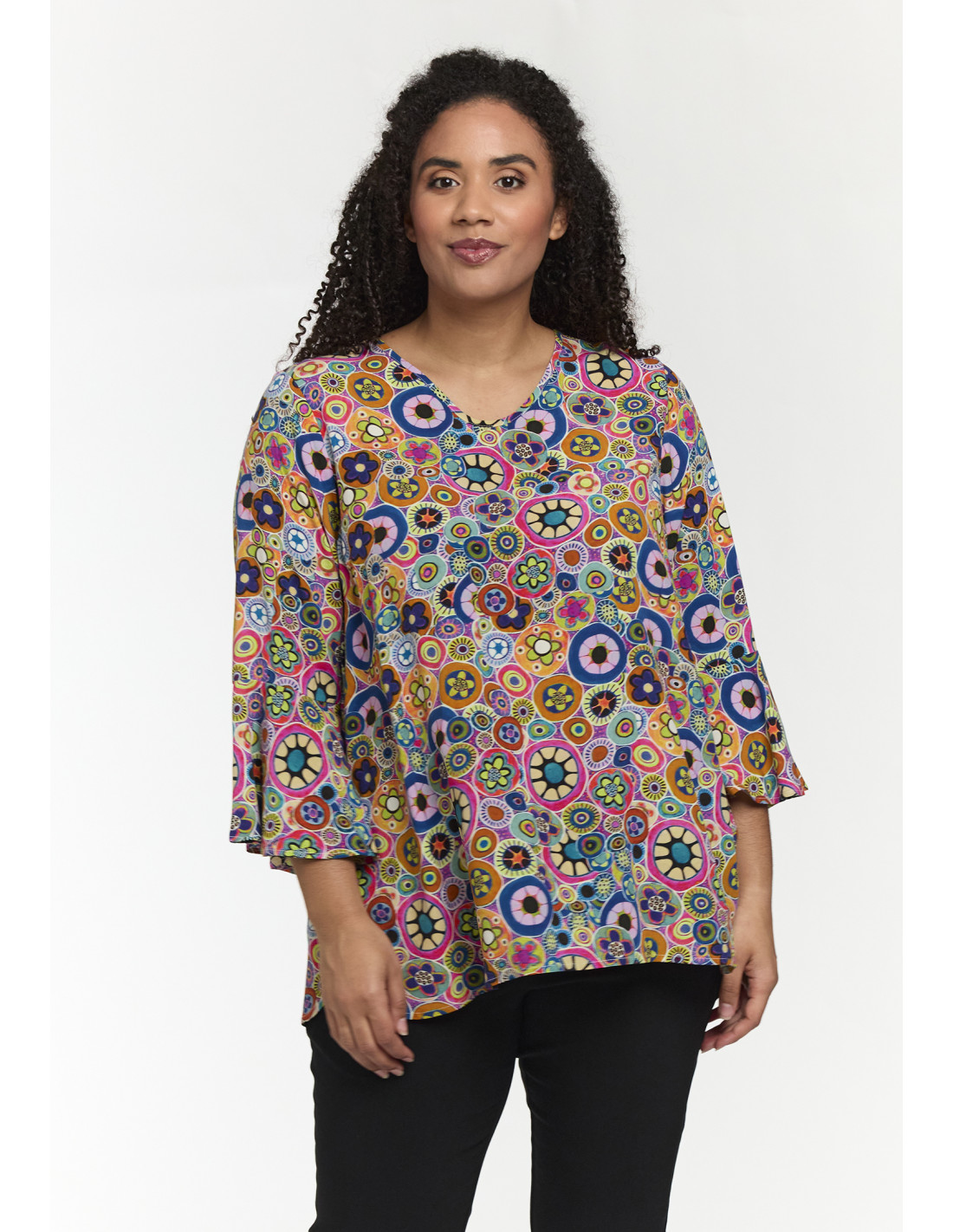 En bluse i 100 % viskose med et fargerikt, sirkulært flerfarget trykk i blå, rosa, grønne og hvite nyanser. Modellen har V-hals og lange ermer. Den løse passformen og det myke materialet gir et avslappet og feminint utseende.