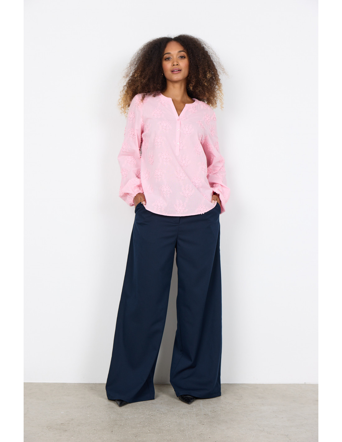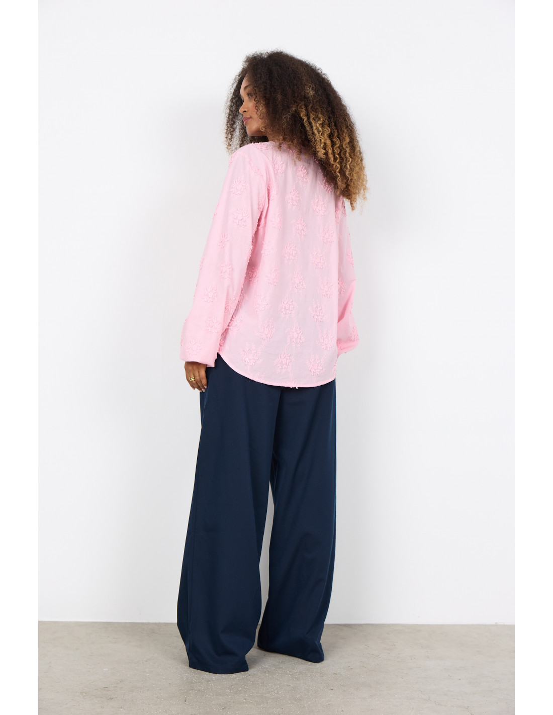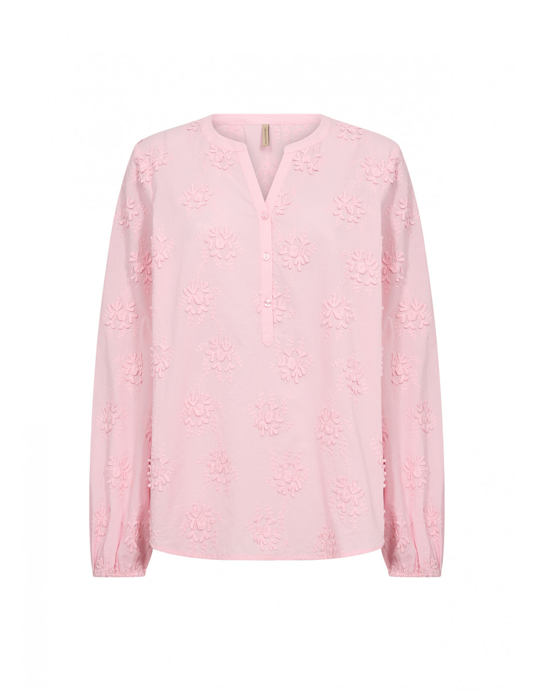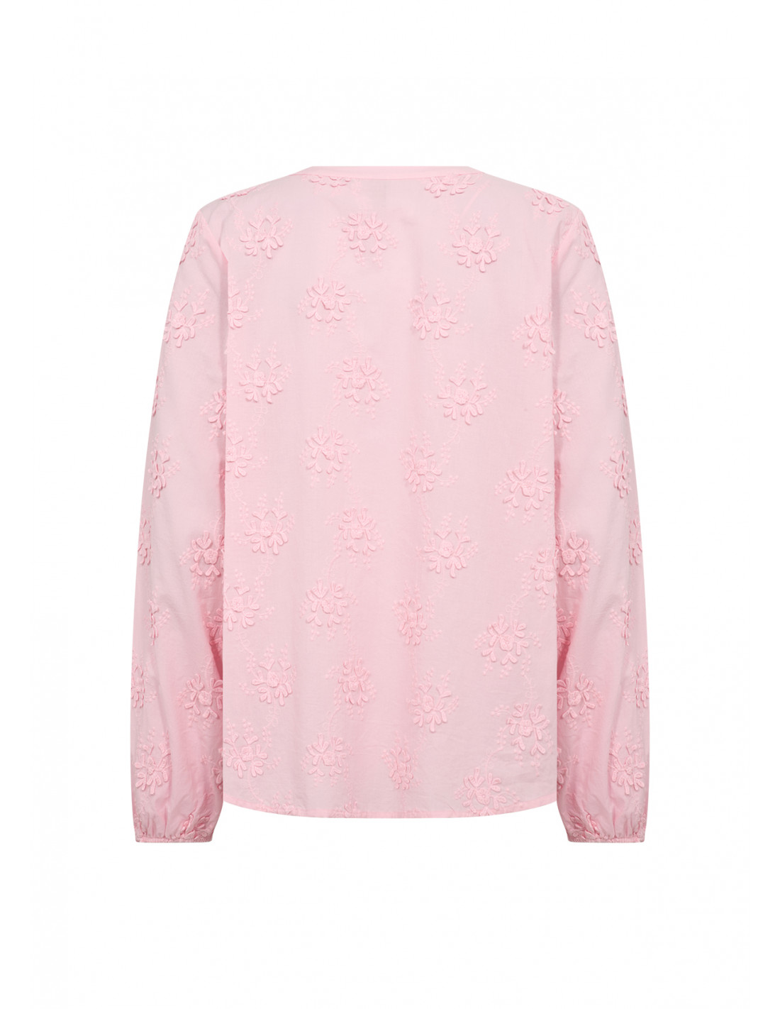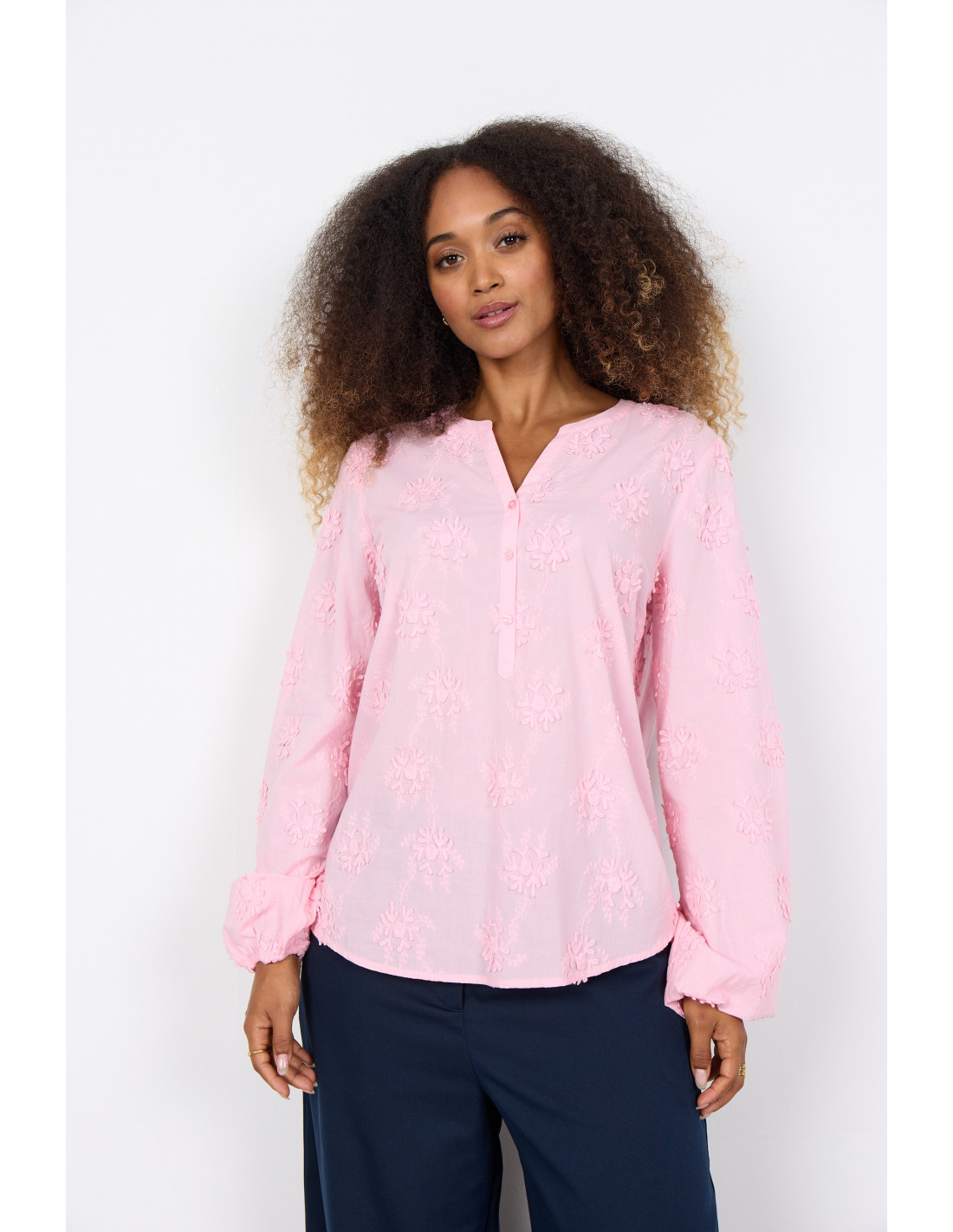 SC-BARBRA 1 er en bluse laget av 100 % økologisk bomull. Den har en diskré v-hals, delvis knappestolpe og heldekkende blomsterbroderi som gir en unik tekstur. Kombiner den med skreddersydde bukser eller et klassisk skjørt for et elegant utseende.