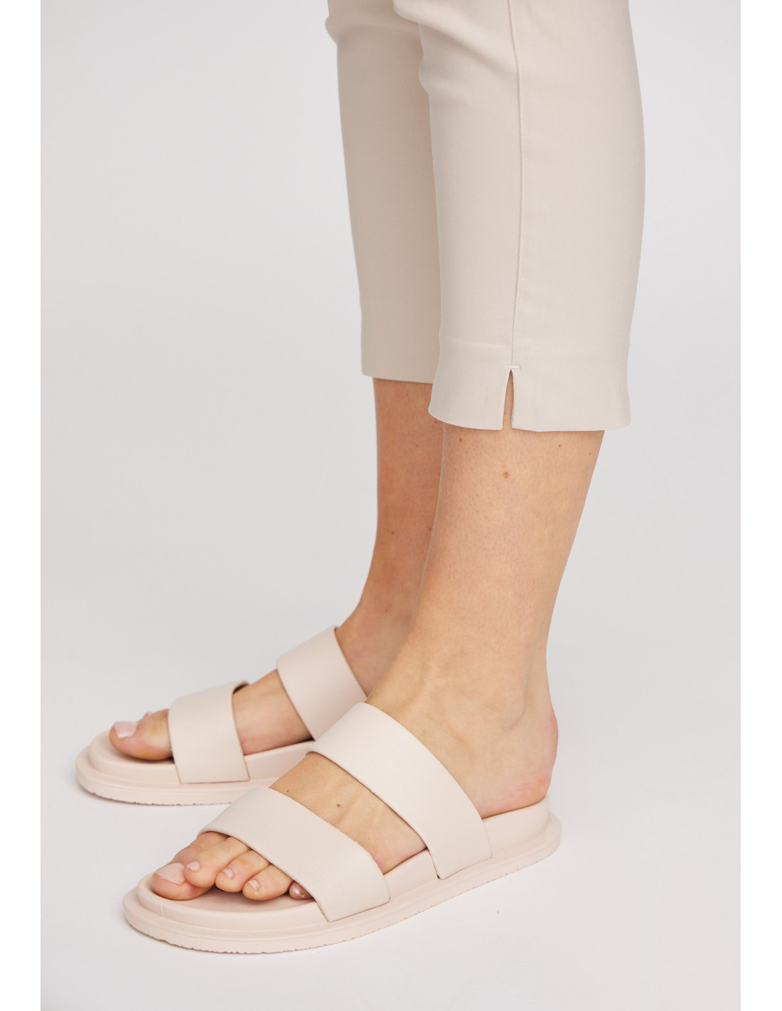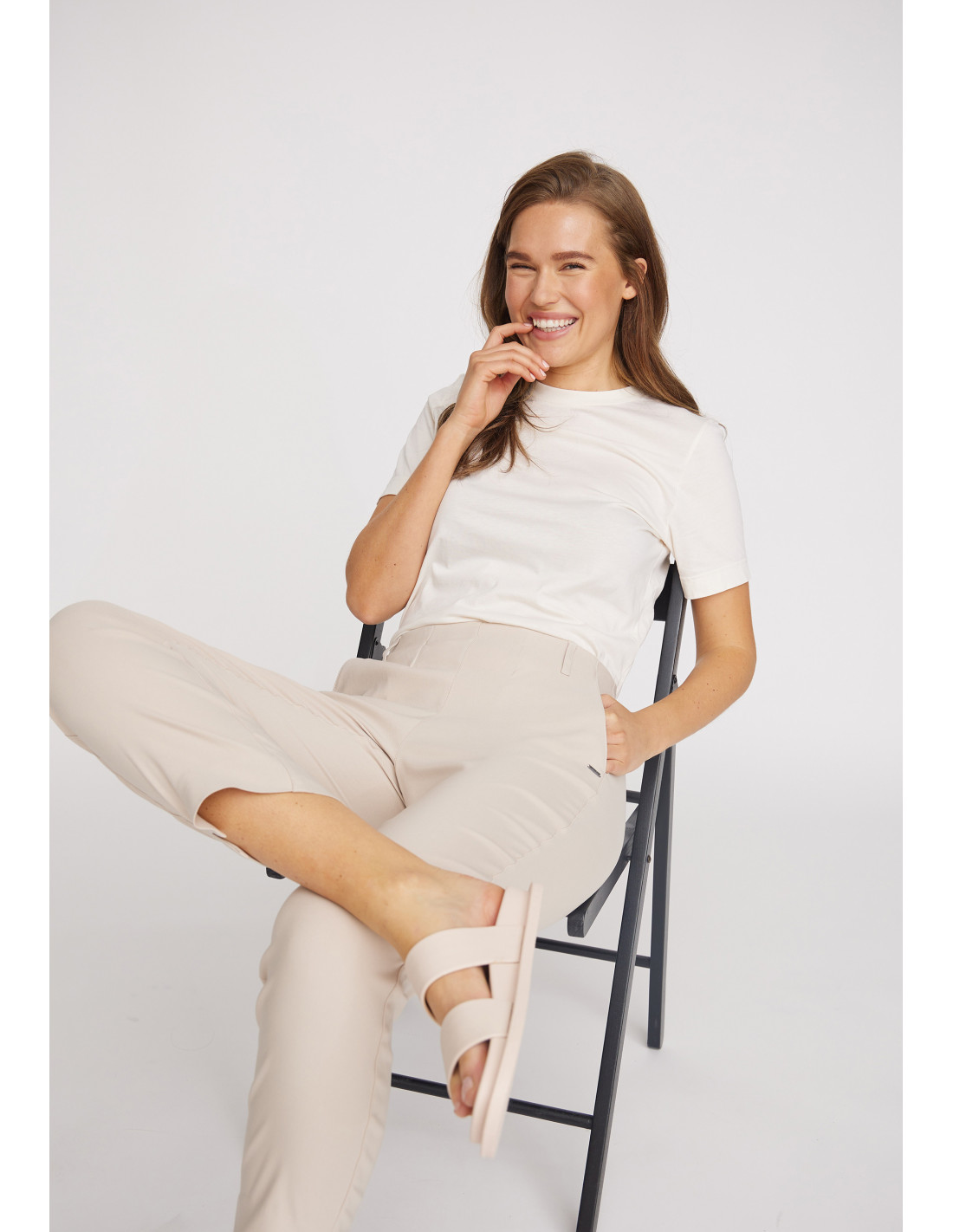 Bukse med rette frontlommer, elastisk linning og beltehemper.