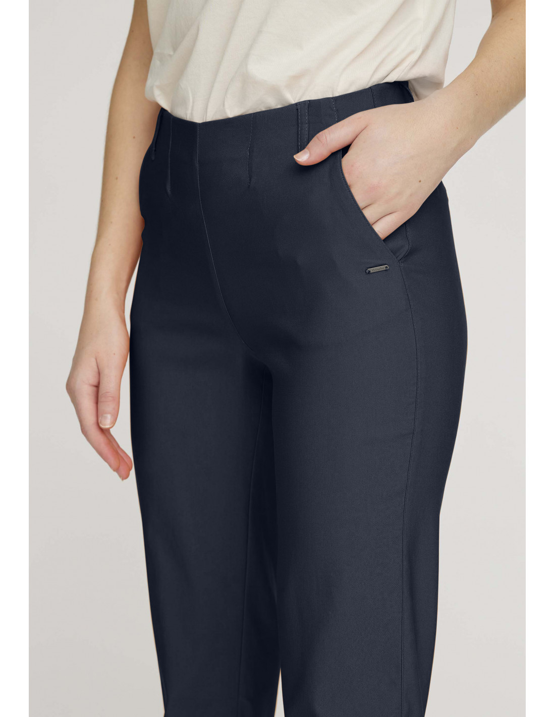 Bukse med rette frontlommer, elastisk linning og beltehemper.