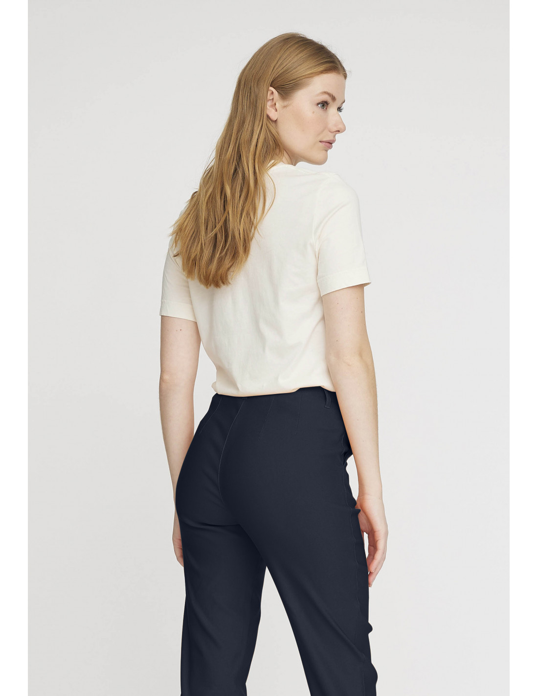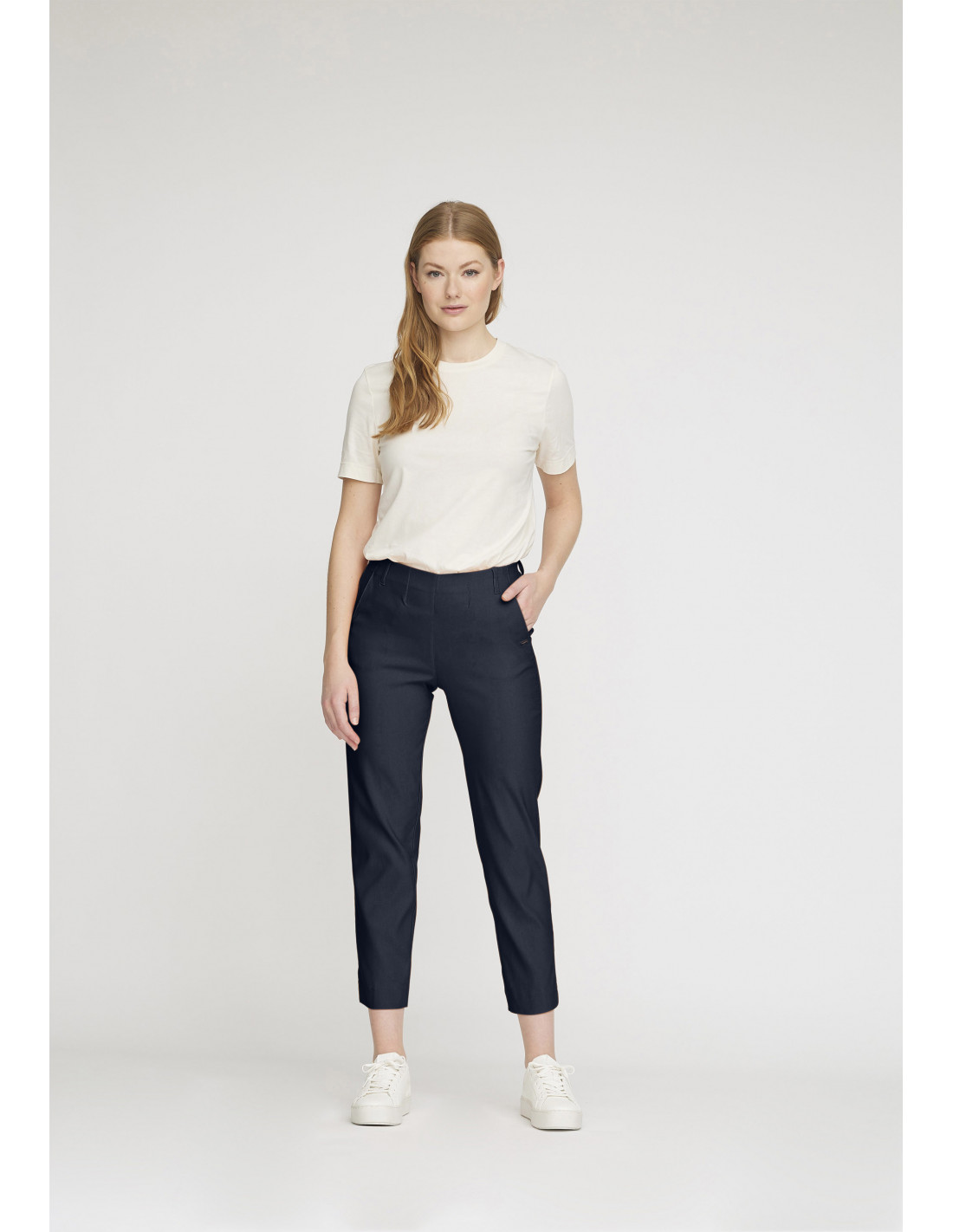 Bukse med rette frontlommer, elastisk linning og beltehemper.