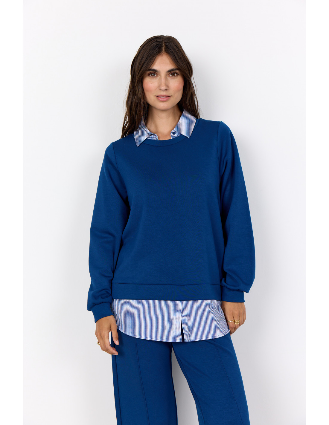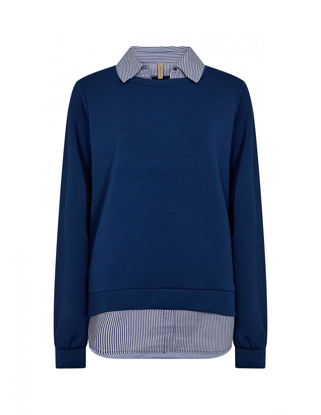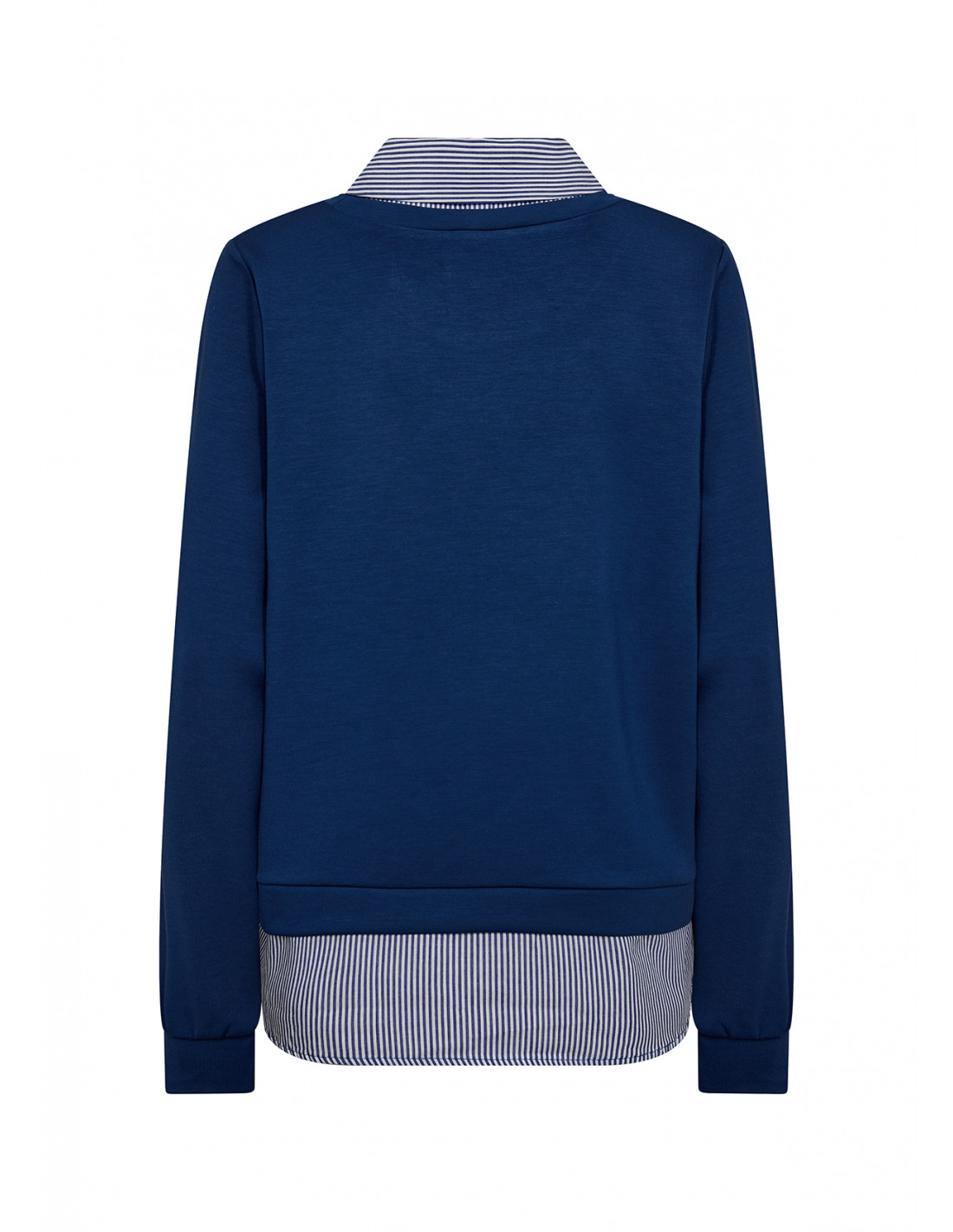 SC-BANU 264 er en bluse laget av 48 % modal, 48 % polyester og 4 % elastan. Denne blusen har en stilig stripete krage og kant, lange ermer og rund hals. Den passer godt til både avslappede jeans og skreddersydde bukser for et elegant utseende.