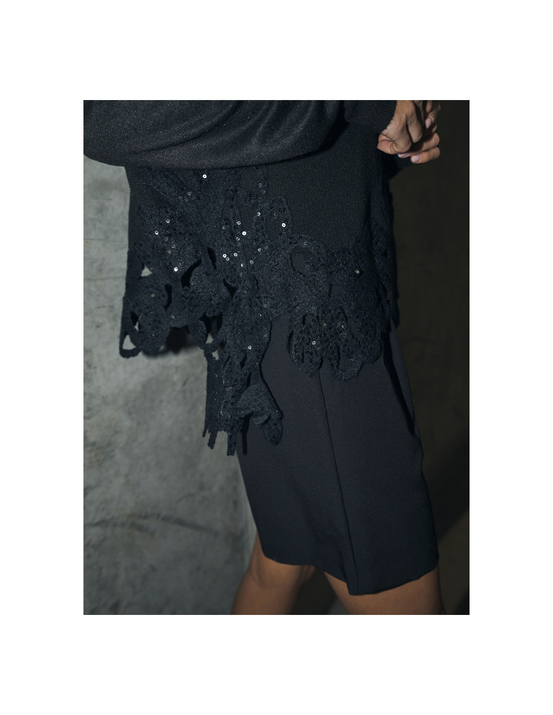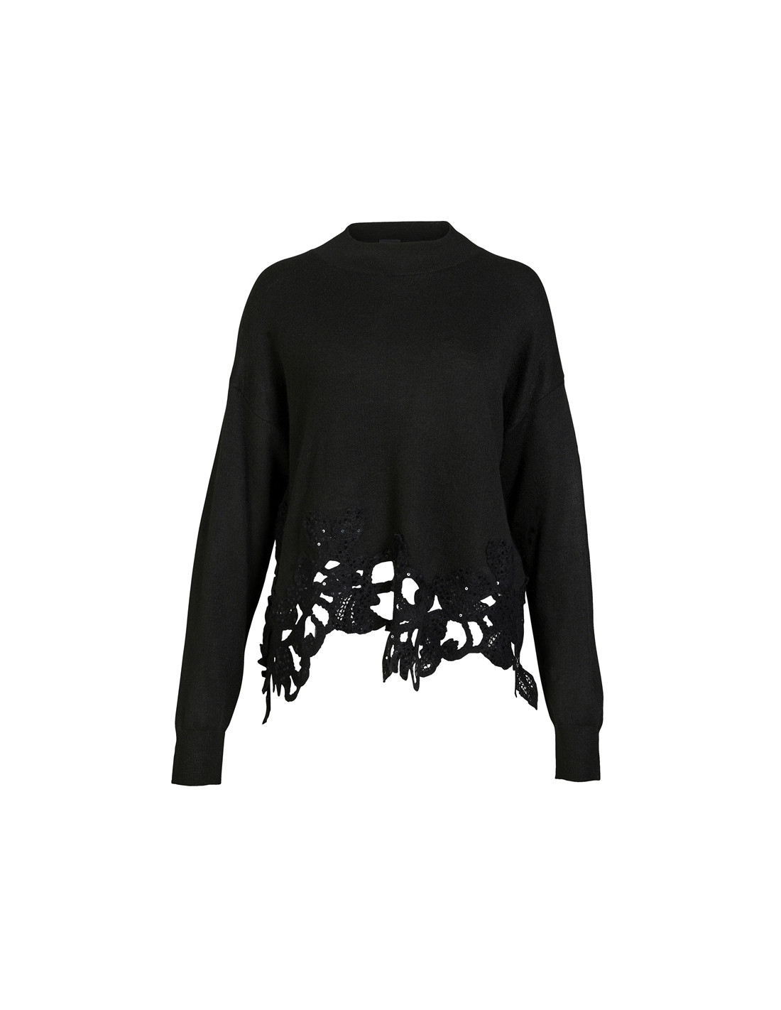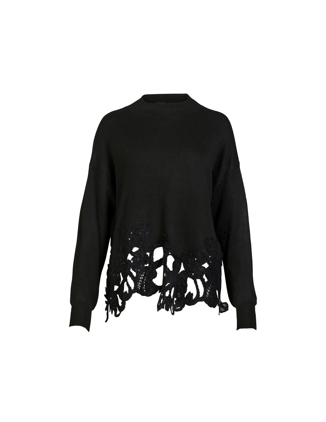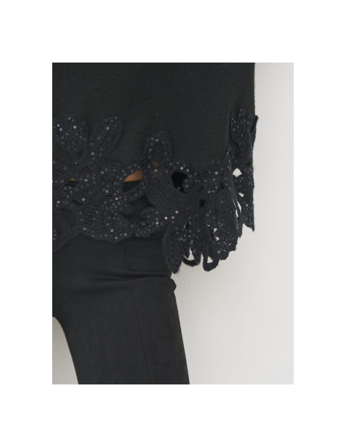 Gi antrekket ditt en eksklusiv touch med denne strikkede ponchoen med dekorativ blonderkant. Den har en avslappet passform og rund halsutringning, mens den fremtredende blonderkanten nederst legger til et feminint og festlig utseende. Det lett gjennomsiktige blonderpanelet er prydet med små paljetter som fanger lyset og skaper en subtil glans.