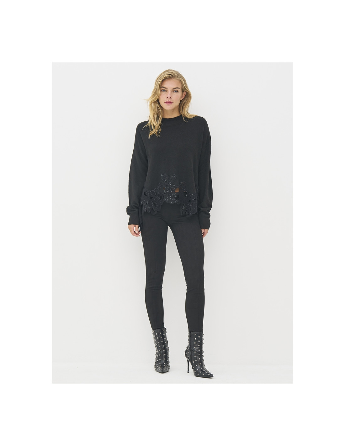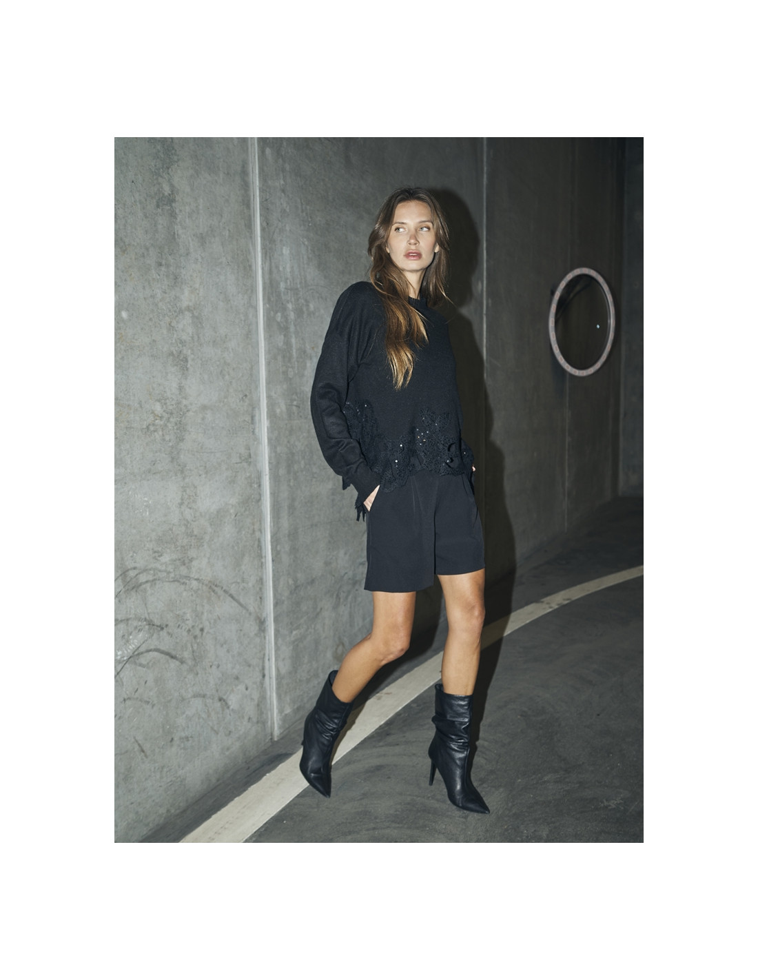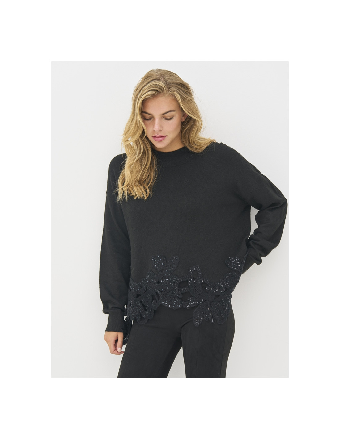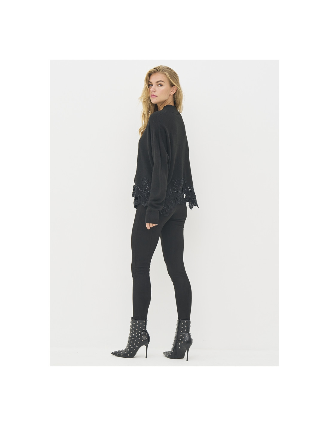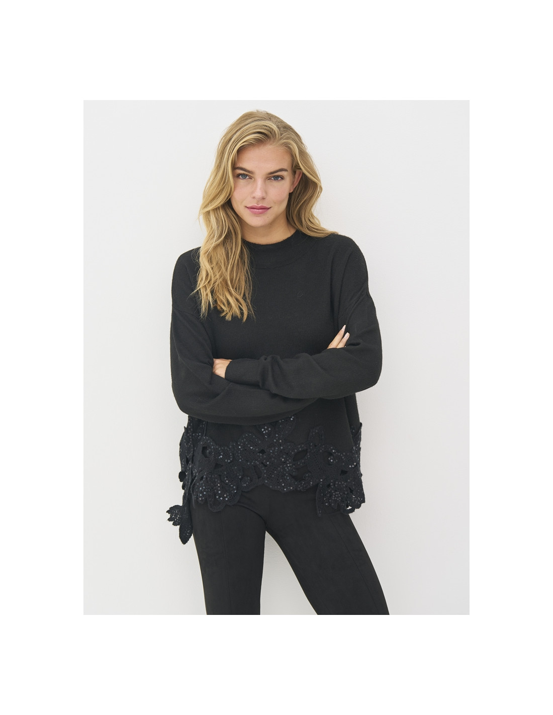 Gi antrekket ditt en eksklusiv touch med denne strikkede ponchoen med dekorativ blonderkant. Den har en avslappet passform og rund halsutringning, mens den fremtredende blonderkanten nederst legger til et feminint og festlig utseende. Det lett gjennomsiktige blonderpanelet er prydet med små paljetter som fanger lyset og skaper en subtil glans.