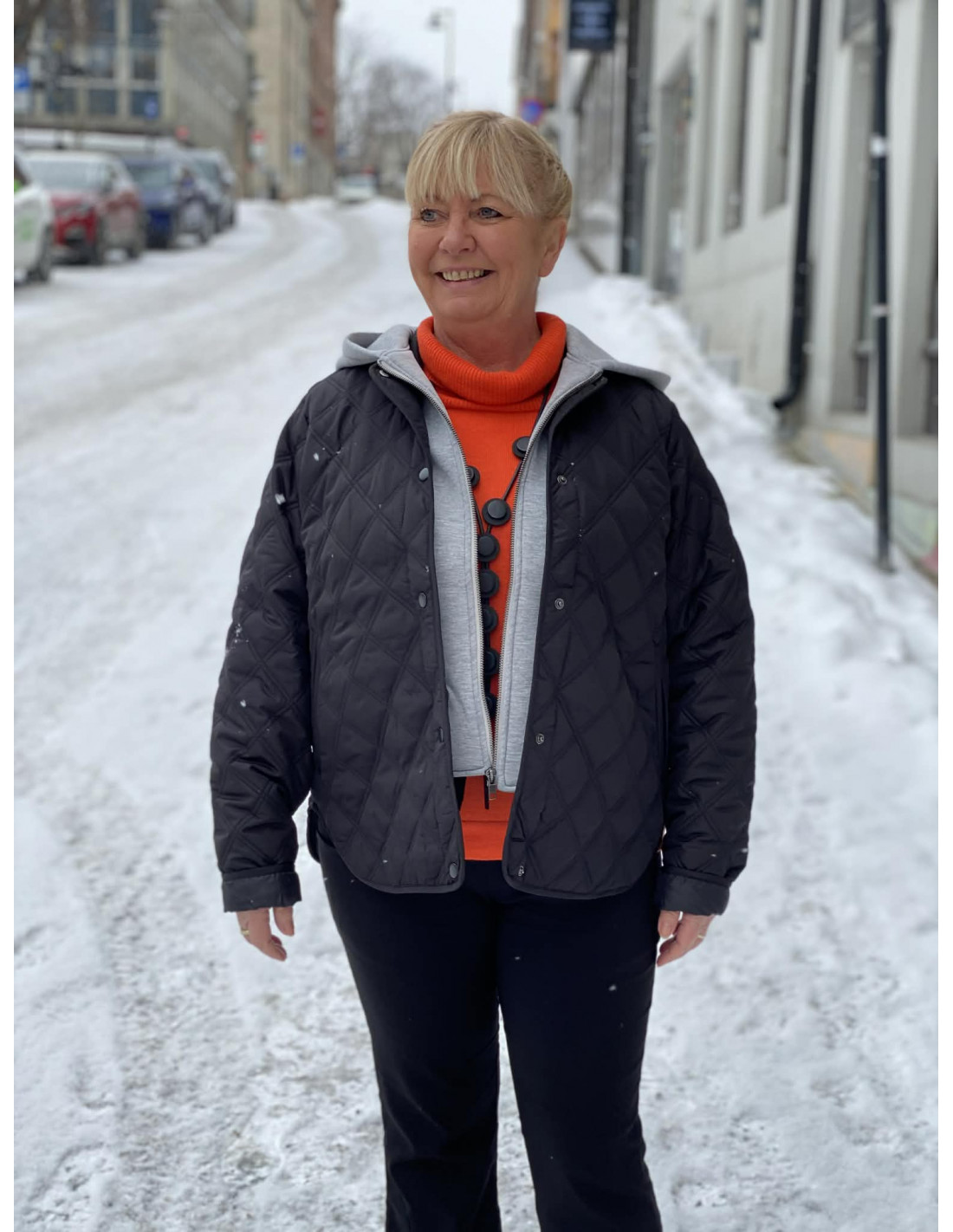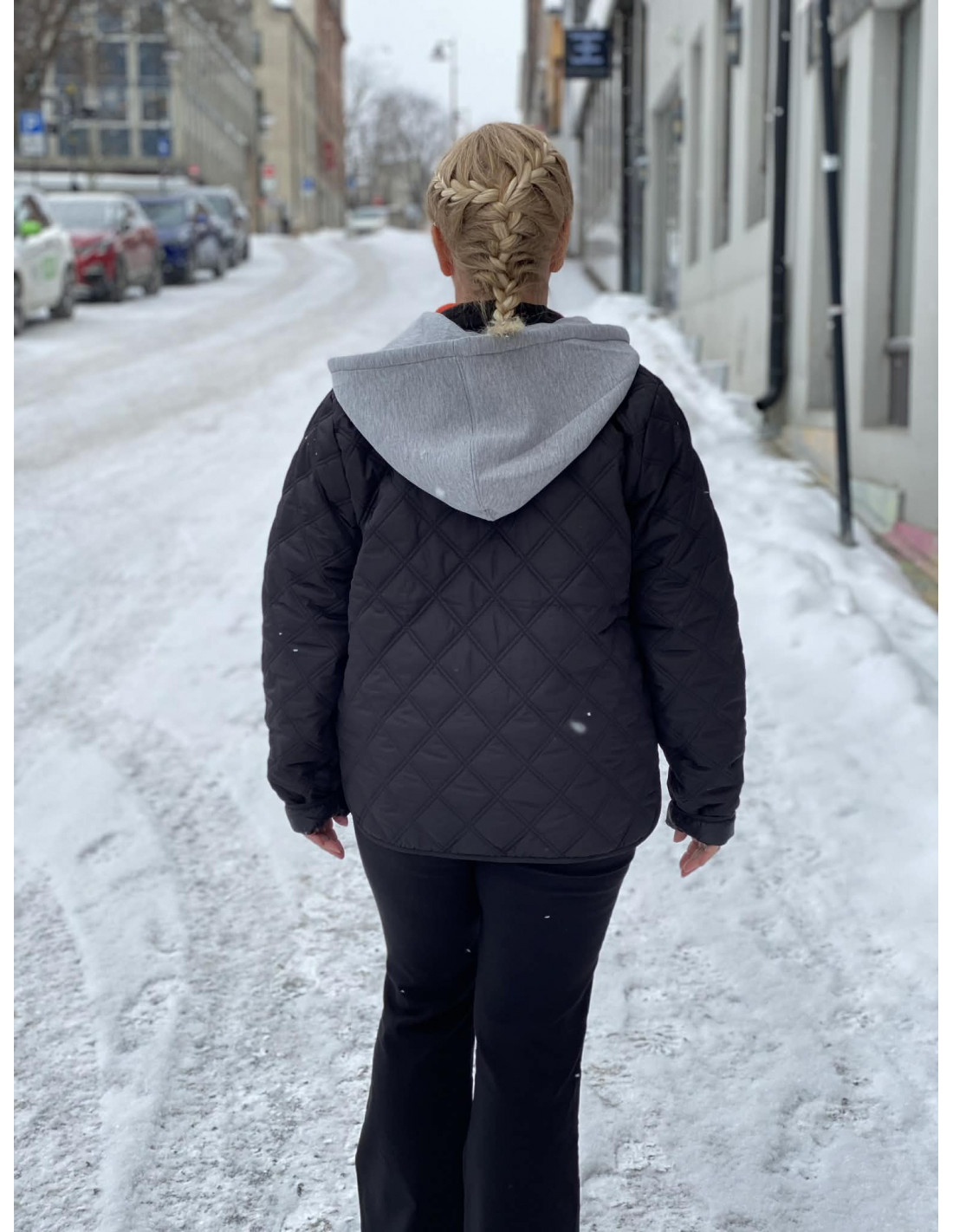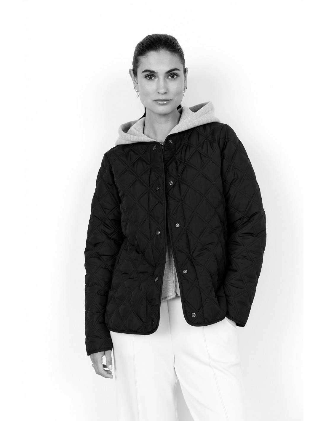 SC-FENYA 75. Denne jakken har et quiltet mønster, trykknapper og en påsydd hette. Den passer godt til uformelle antrekk og gir et ekstra lag med varme.