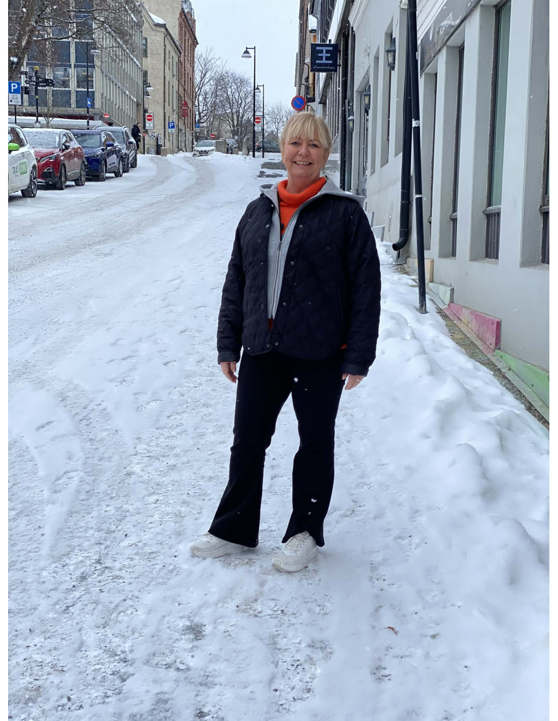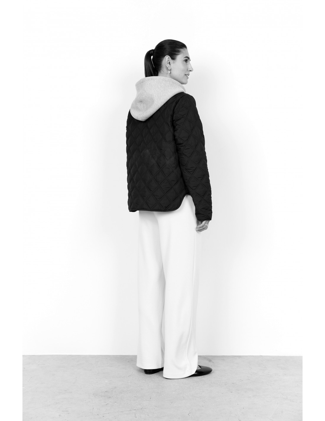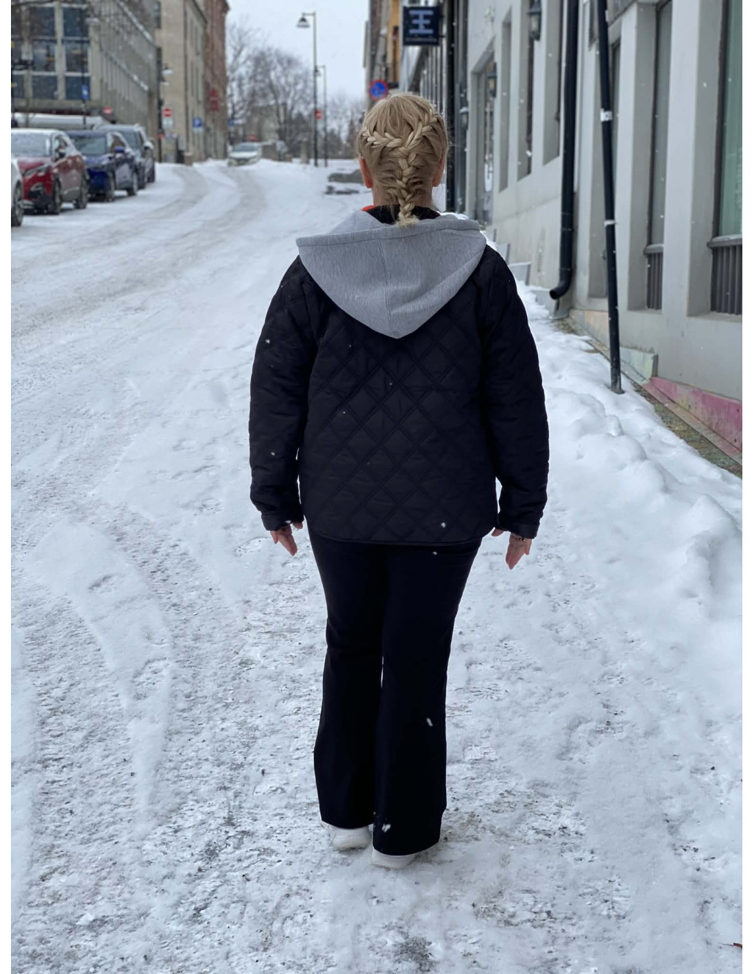 SC-FENYA 75. Denne jakken har et quiltet mønster, trykknapper og en påsydd hette. Den passer godt til uformelle antrekk og gir et ekstra lag med varme.
