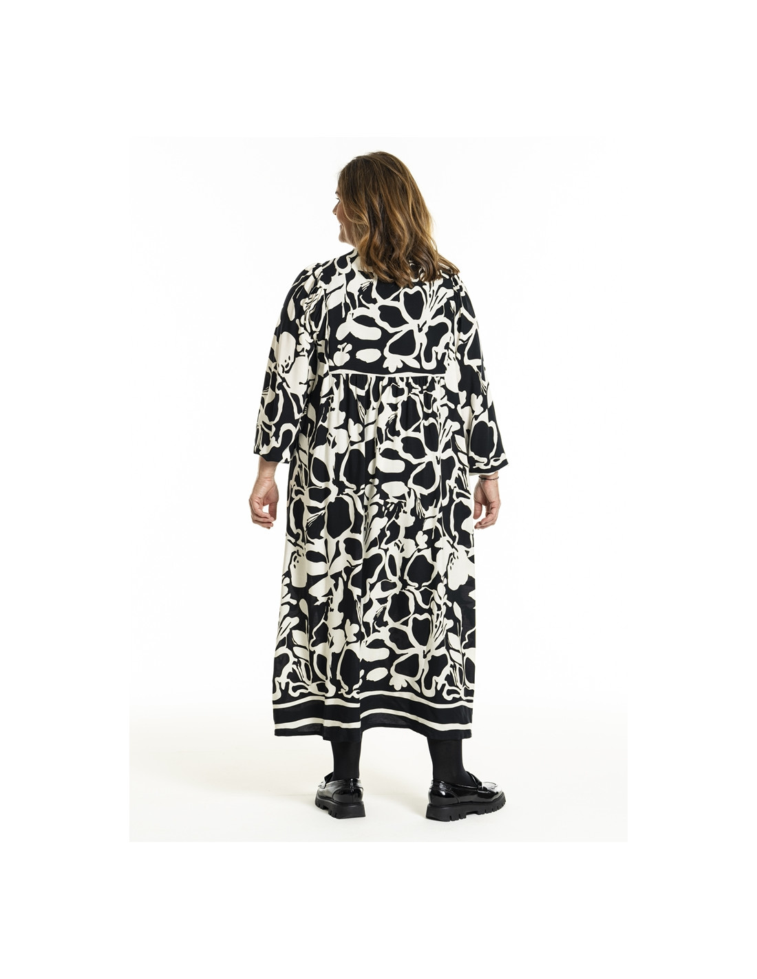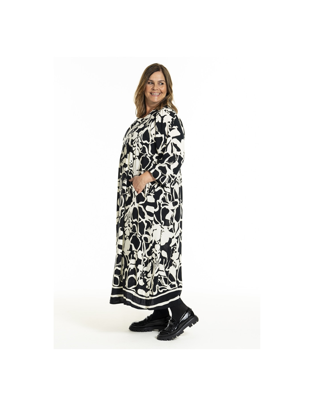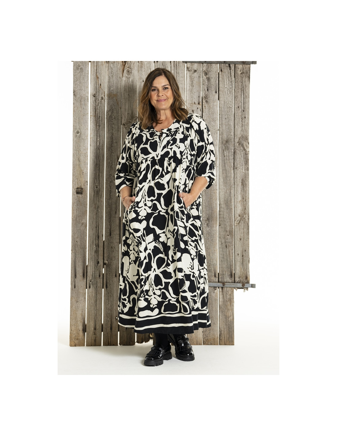 Vakker, lang kjole med svart/offwhite blomsterprint med stripete bunn. Denne kjolen er laget av 100% viskose og er A-formet med lange ermer med strikk i ermene. O-hals med V-detalj og legg foran. Med sidelommer.