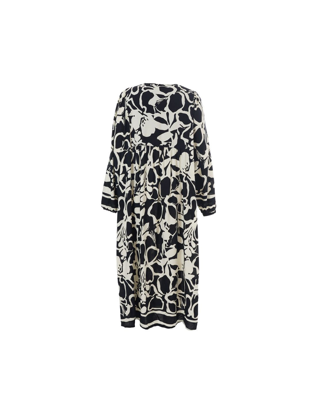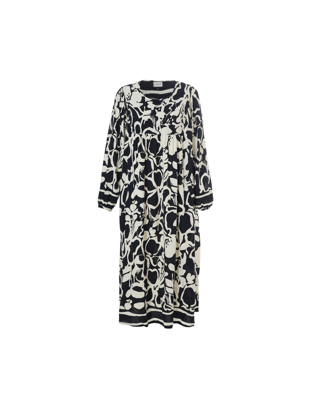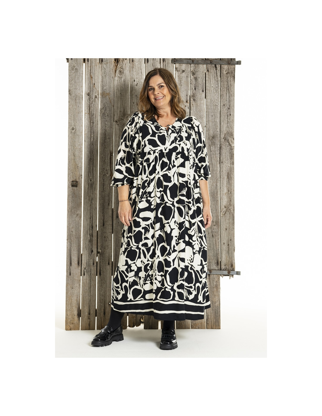 Vakker, lang kjole med svart/offwhite blomsterprint med stripete bunn. Denne kjolen er laget av 100% viskose og er A-formet med lange ermer med strikk i ermene. O-hals med V-detalj og legg foran. Med sidelommer.