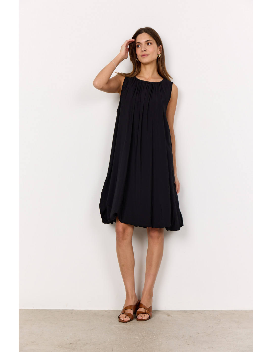 SC-SIDRA 2 Kjolen er laget av 85% LENZING™ ECOVERO™ Viskose og 15% Nylon. Kjolen har en ermeløs design med en rynket utringning og en flytende silhuett som faller til en knelengde.