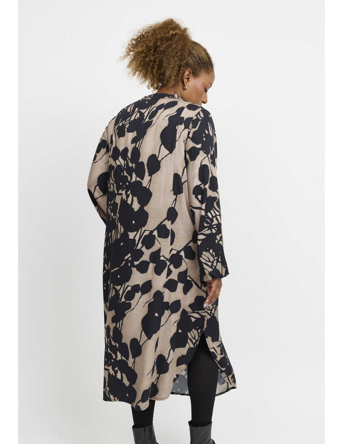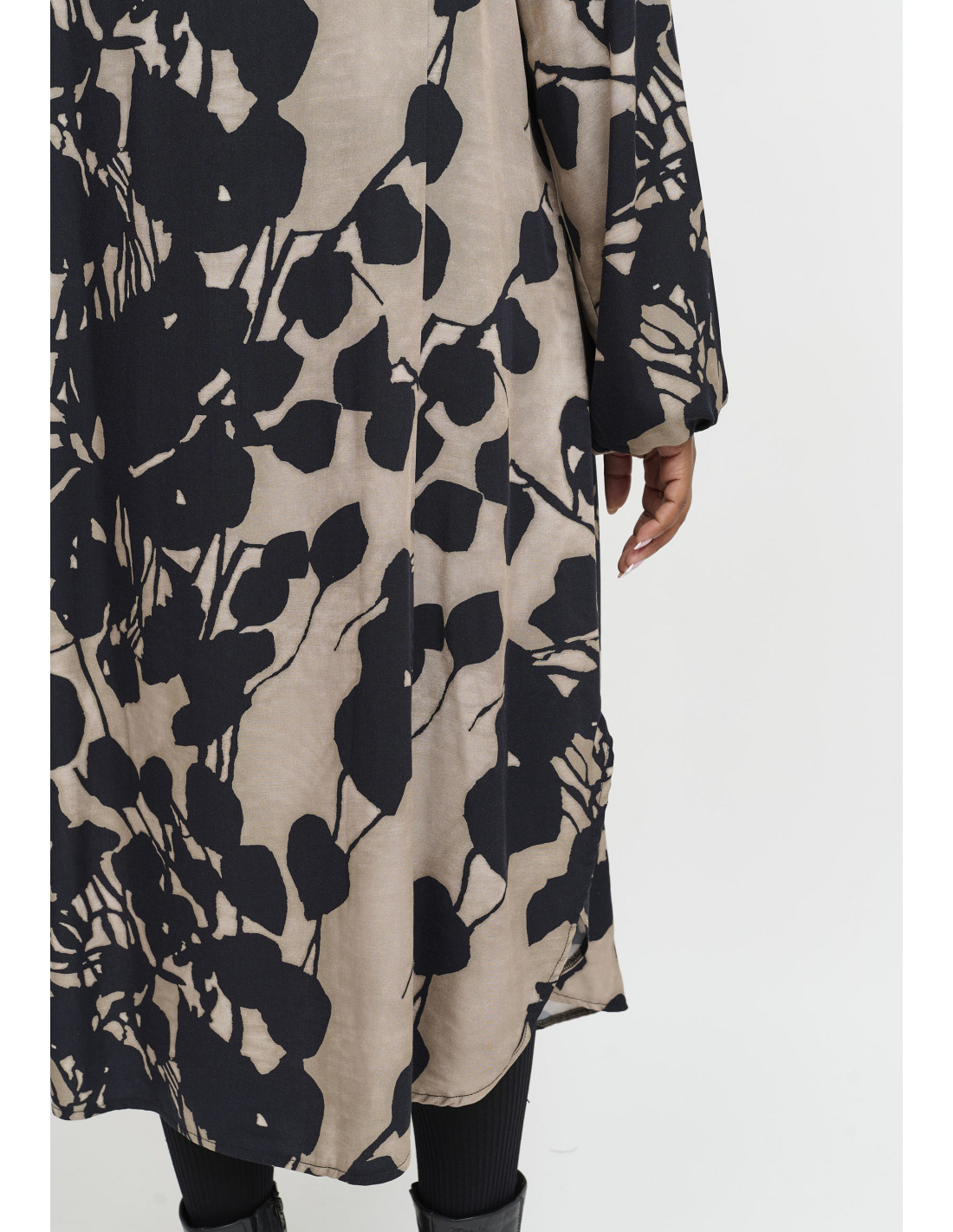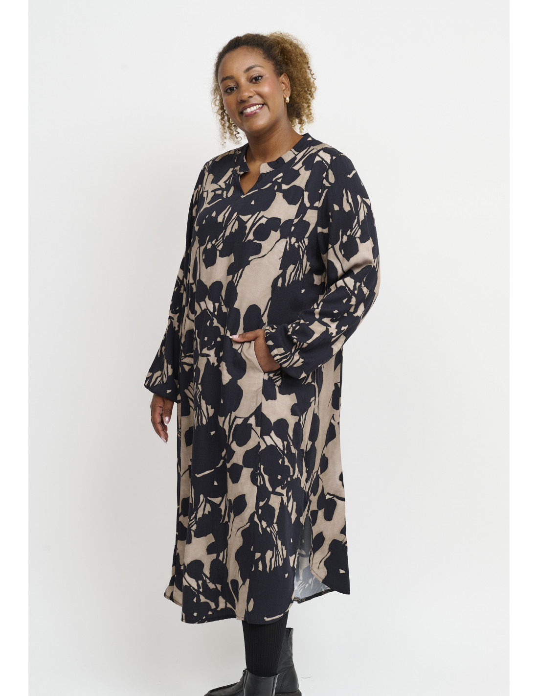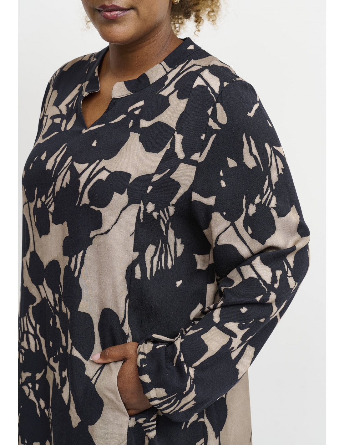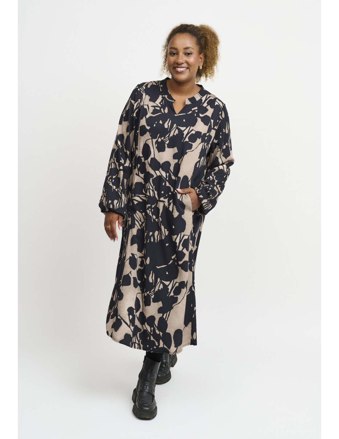 En lang og elegant kjole med et kunstnerisk trykk i kremfarget og svart, som gir et sofistikert og moderne utseende. A-formen gir god vidde og et vakkert fall, mens det rene viskosestoffet føles lett og komfortabelt. Lange ermer og praktiske sidelommer gir designet funksjonalitet.
