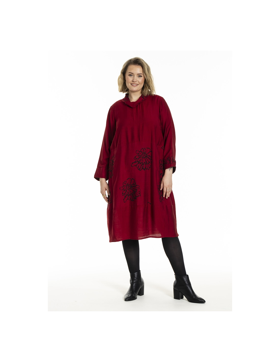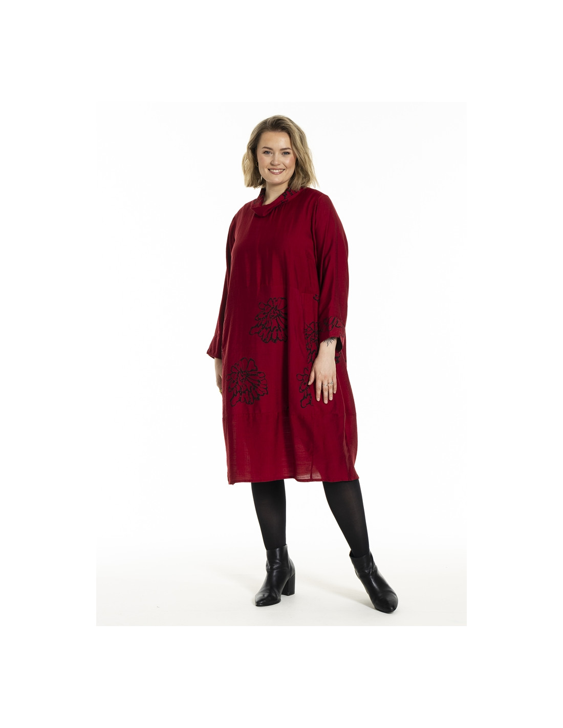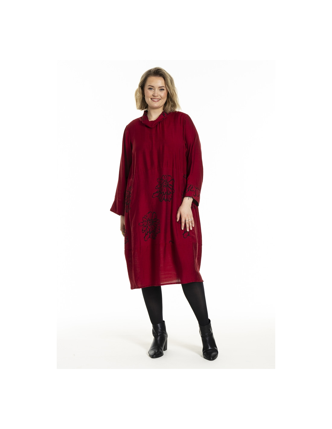 En elegant kjole i 80 % viskose og 20 % nylon, designet med en høy halsutringning som gir stoffet ekstra fall og bevegelsesfrihet. Den løse passformen gjør kjolen komfortabel og flatterende, mens de dype fargevariasjonene gir et særegent og sofistikert uttrykk, perfekt for både hverdag og spesielle anledninger.