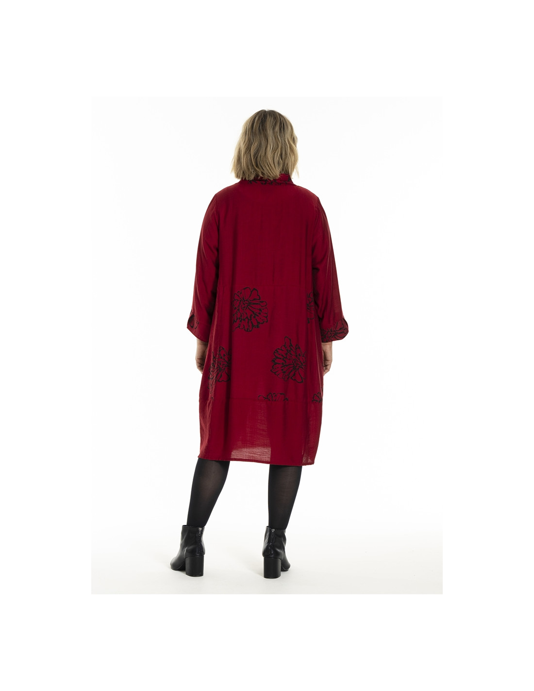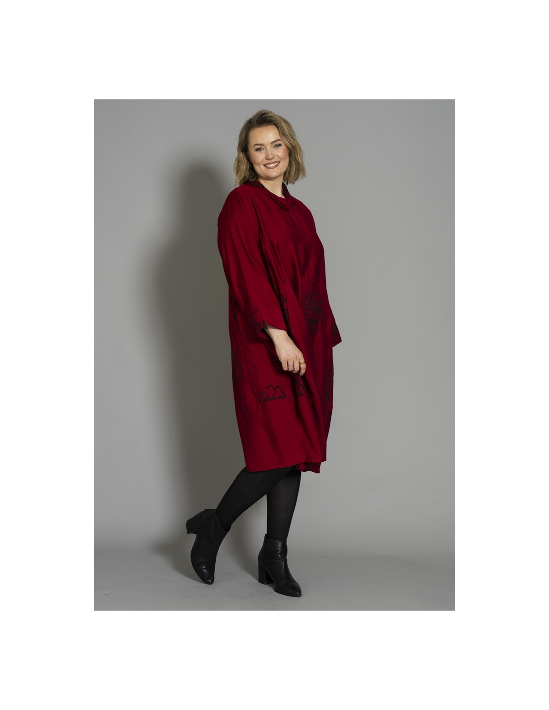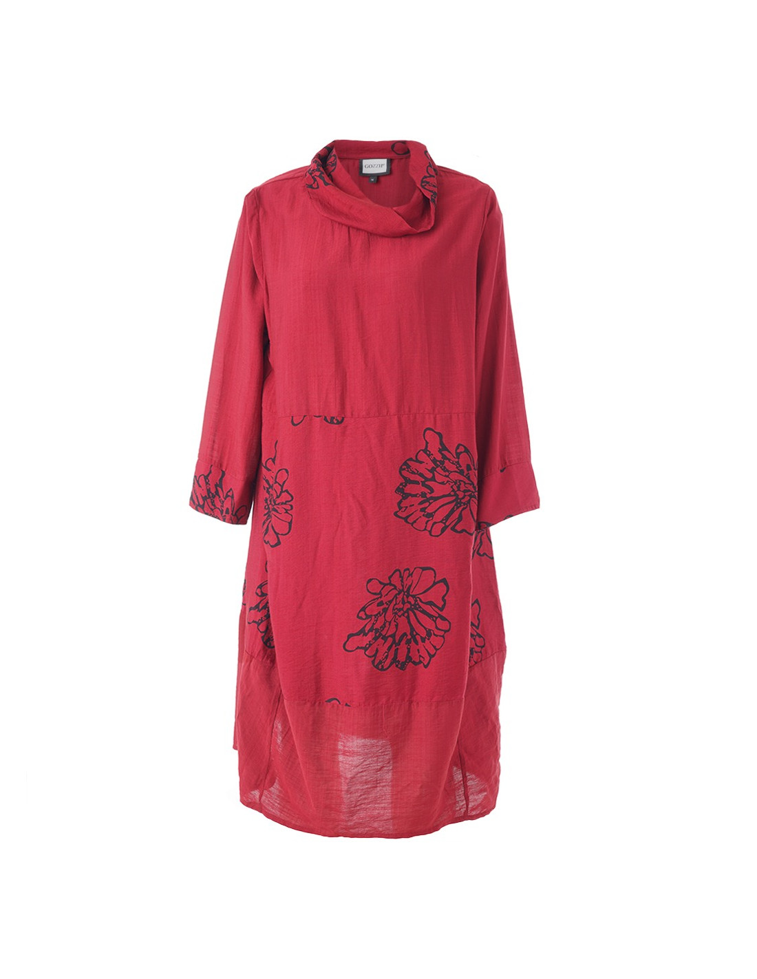 En elegant kjole i 80 % viskose og 20 % nylon, designet med en høy halsutringning som gir stoffet ekstra fall og bevegelsesfrihet. Den løse passformen gjør kjolen komfortabel og flatterende, mens de dype fargevariasjonene gir et særegent og sofistikert uttrykk, perfekt for både hverdag og spesielle anledninger.