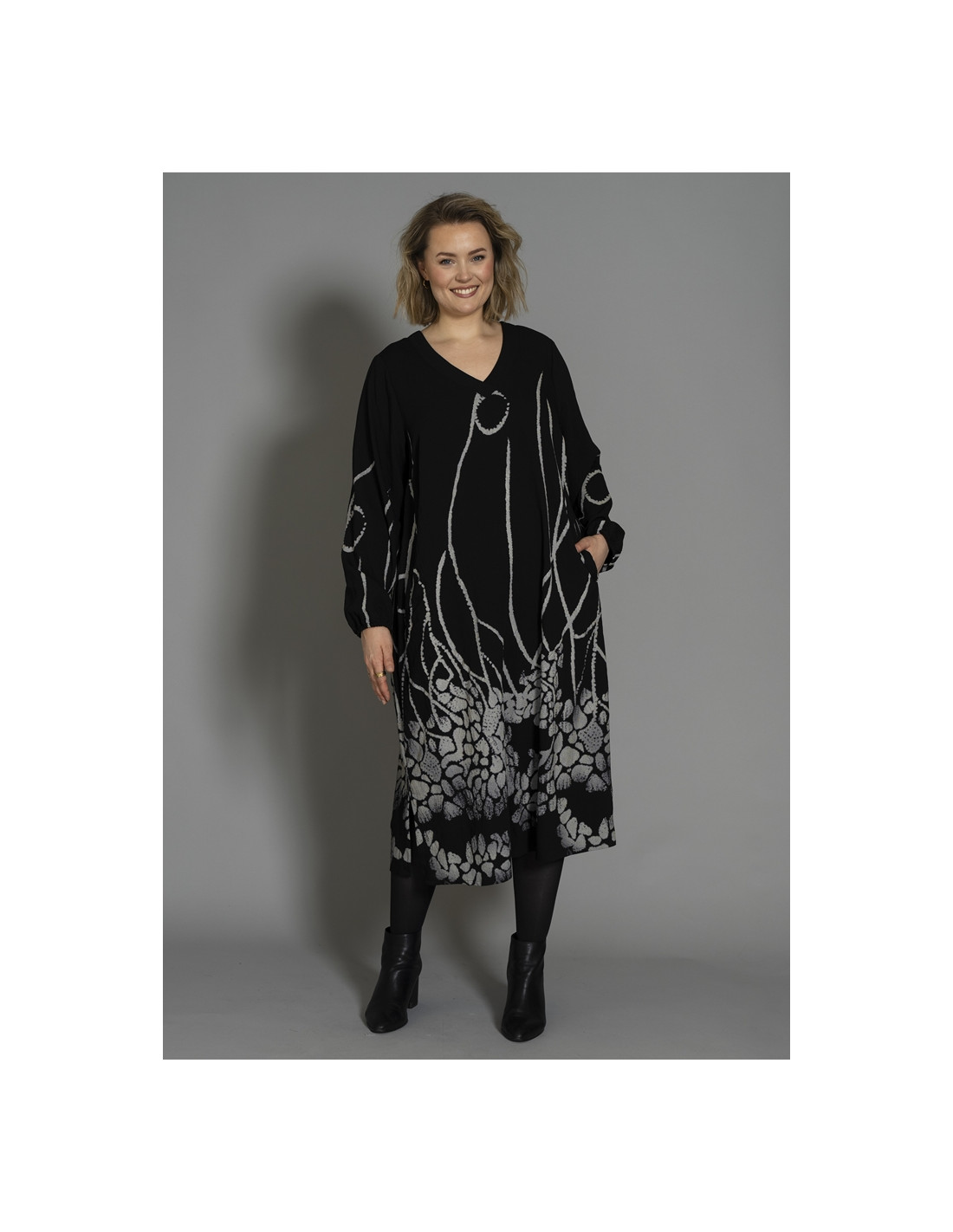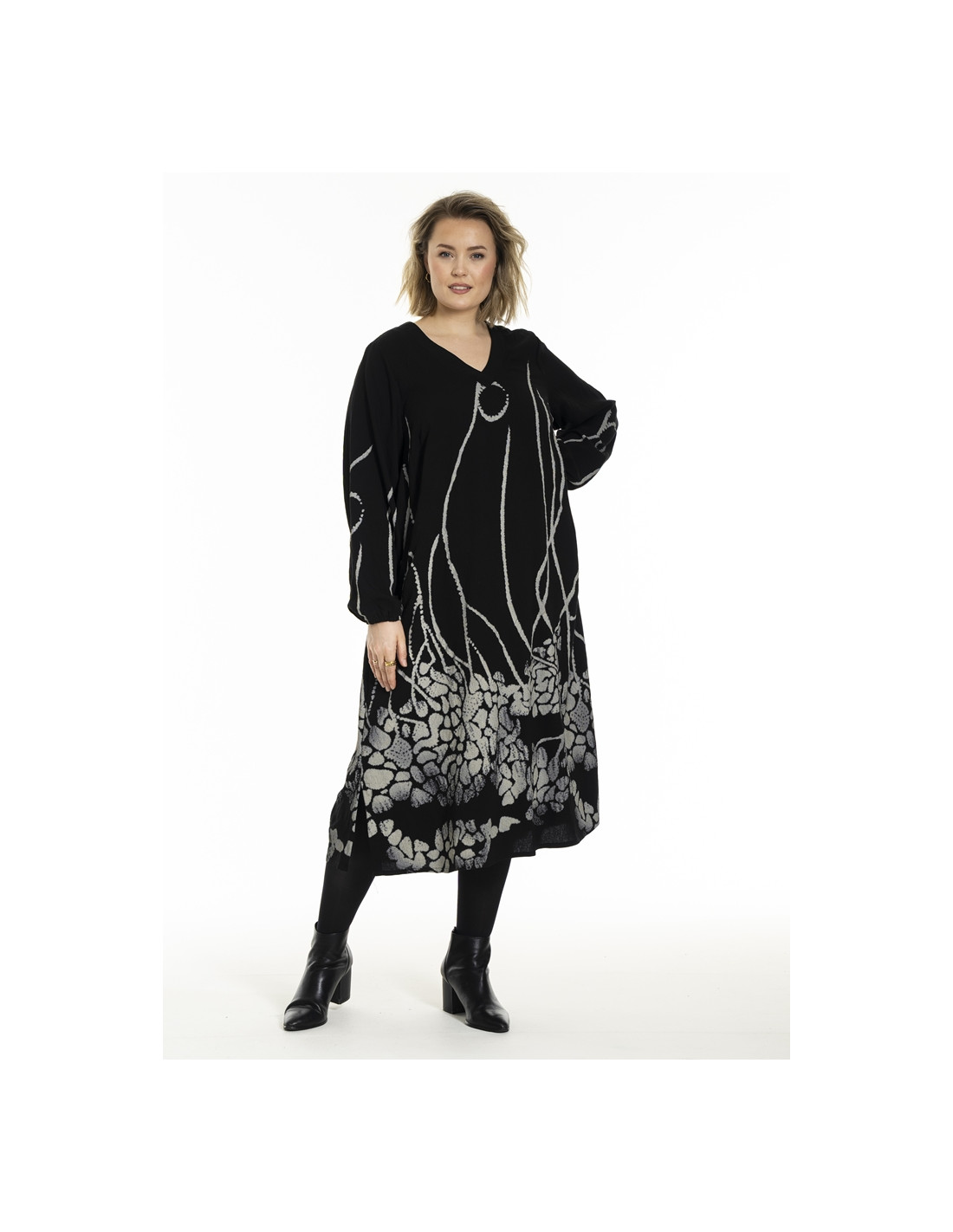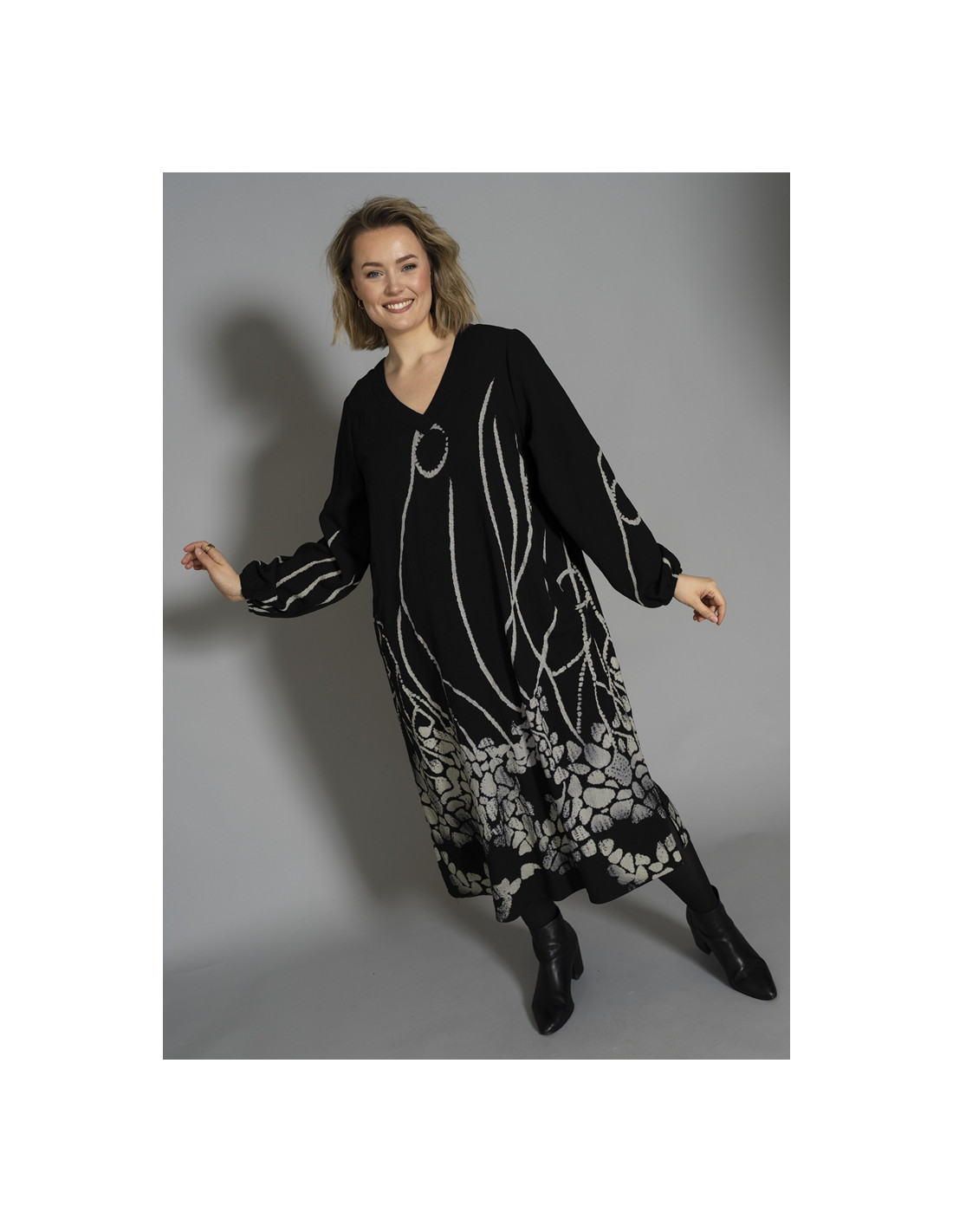En kjole i 80 % viskose og 20 % polyester med et elegant trykk. Modellen har V-hals og lange ermer, mens den løstsittende A-formede silhuetten gir en feminin og komfortabel passform. Den svarte fargen kombinert med det dekorative trykket gjør kjolen ideell for både hverdags og festlige anledninger.