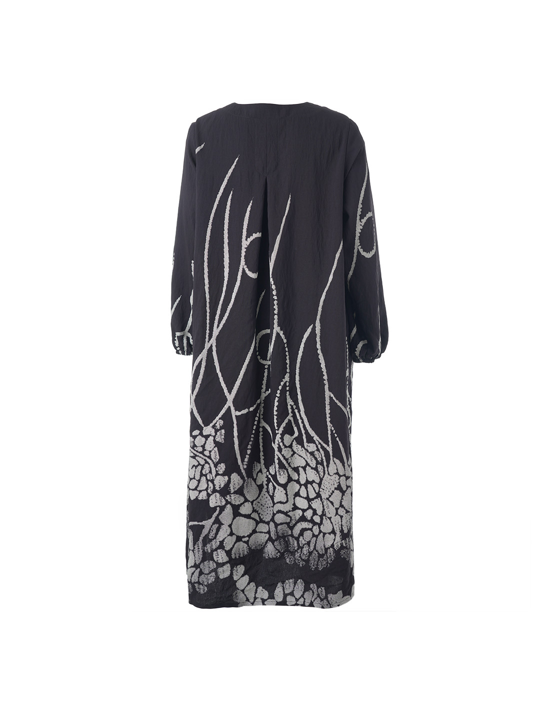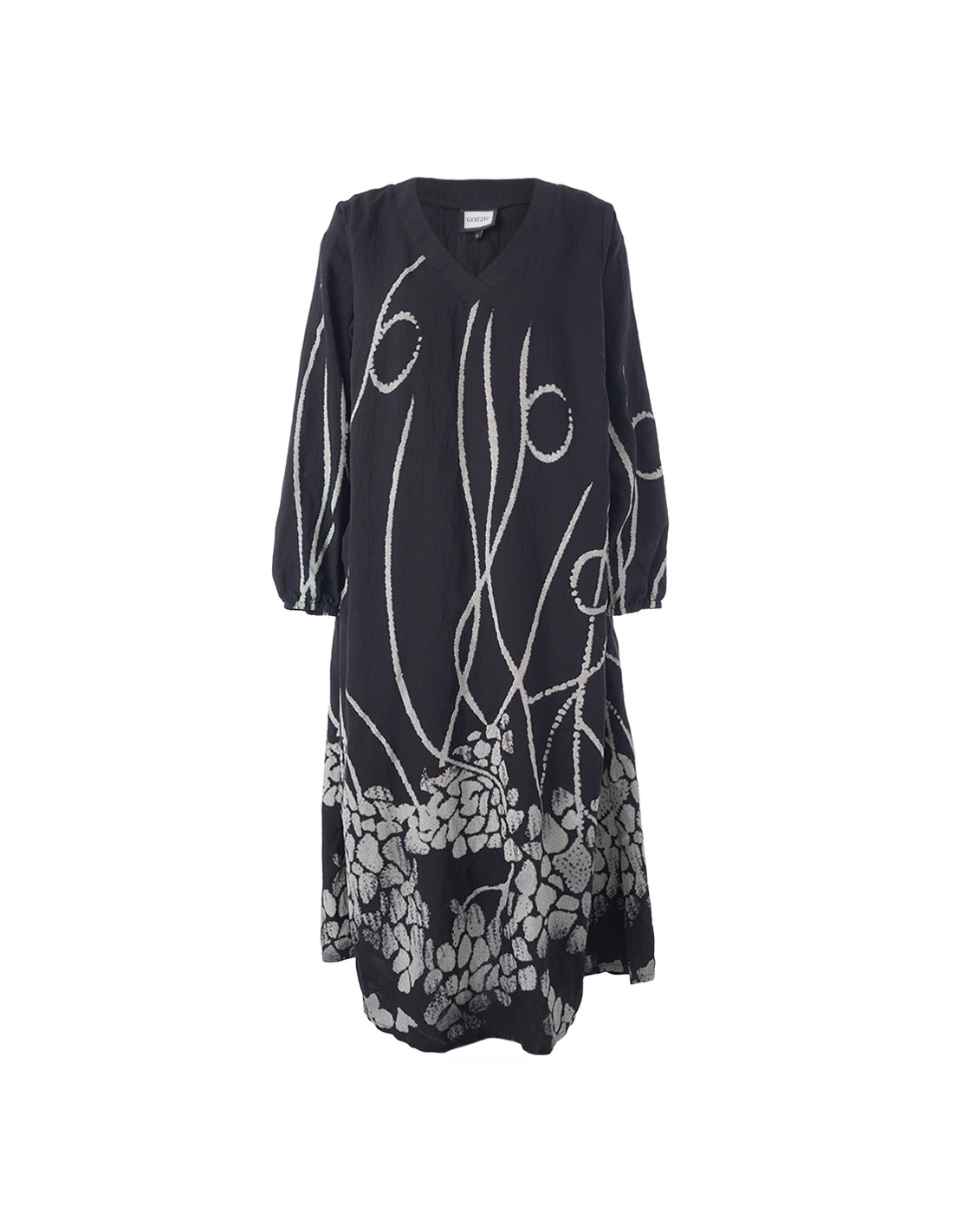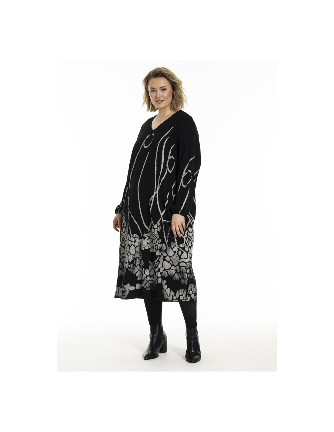 En kjole i 80 % viskose og 20 % polyester med et elegant trykk. Modellen har V-hals og lange ermer, mens den løstsittende A-formede silhuetten gir en feminin og komfortabel passform. Den svarte fargen kombinert med det dekorative trykket gjør kjolen ideell for både hverdags og festlige anledninger.