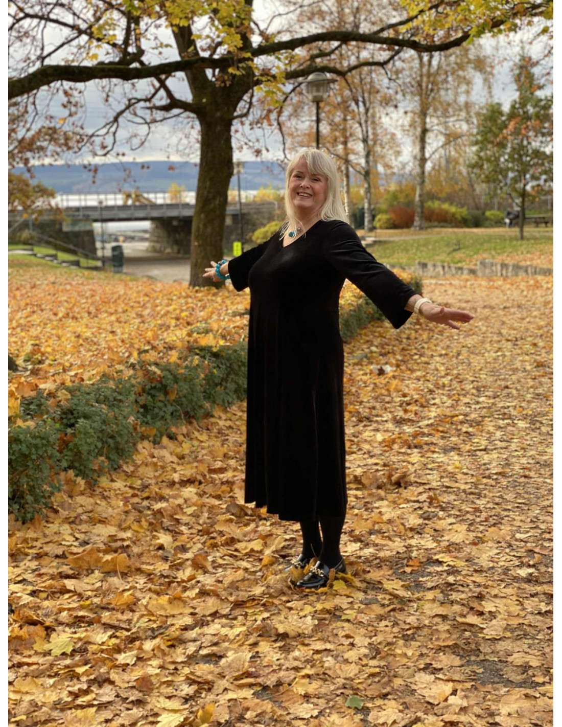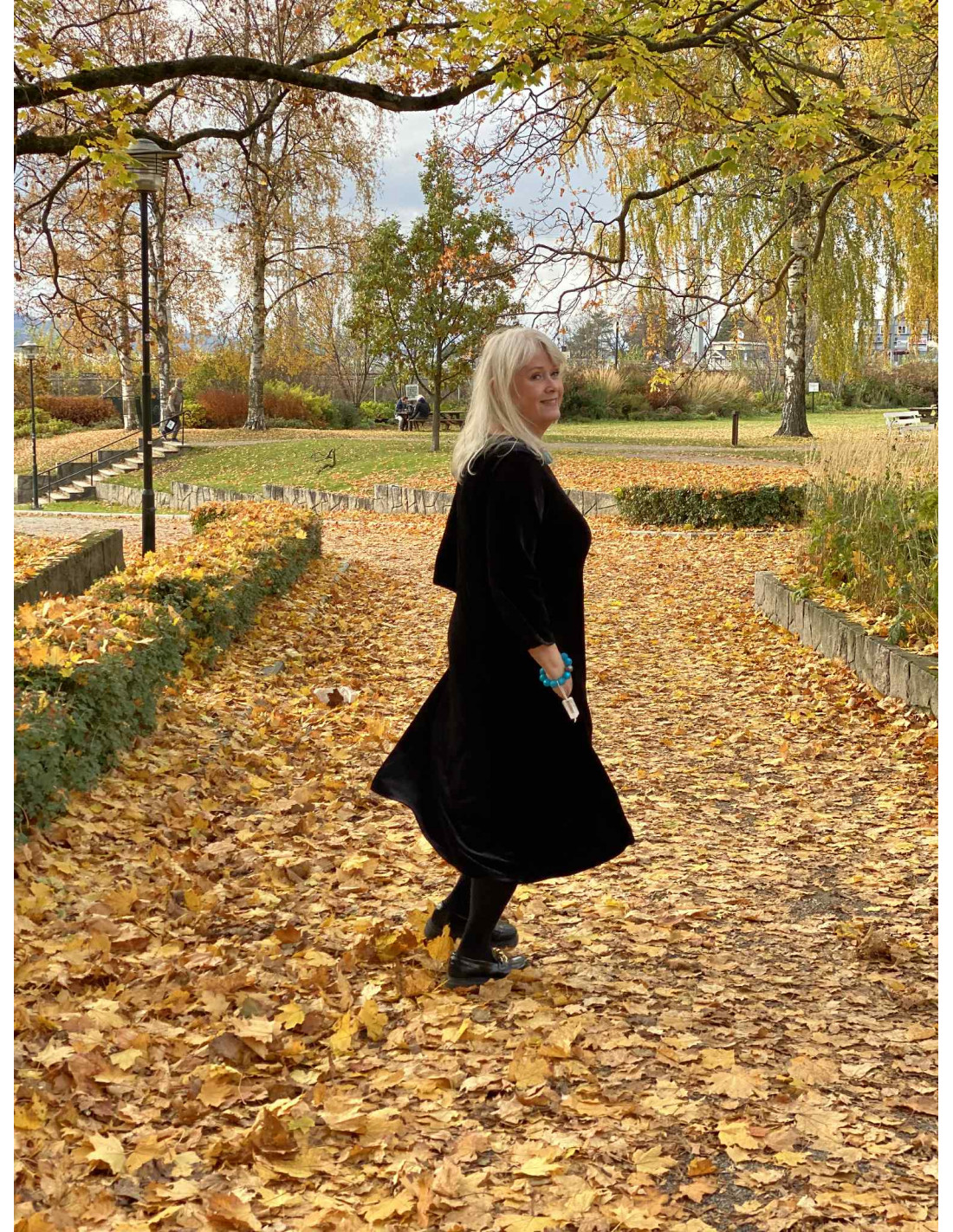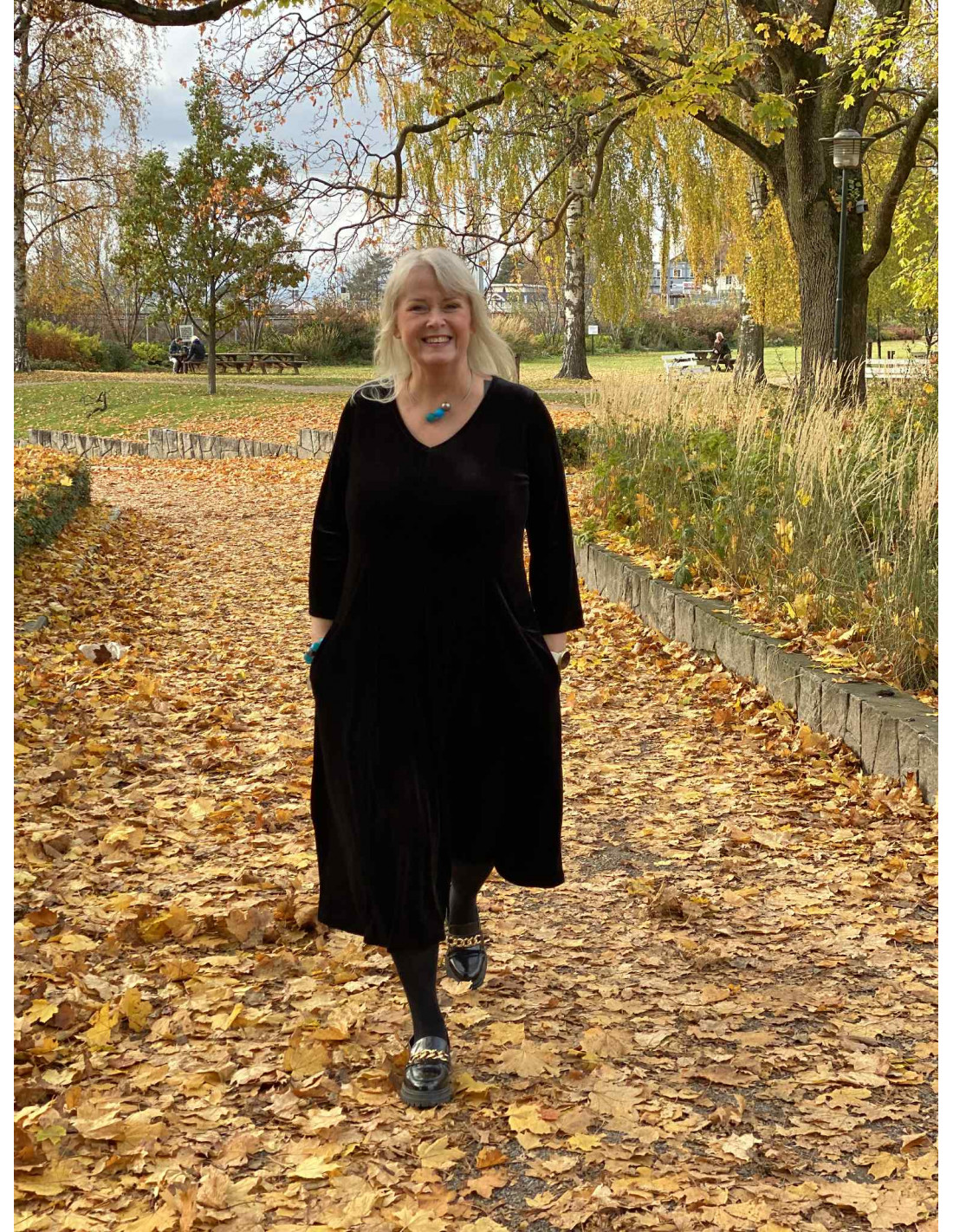 En vakker kjole i velour, som har et nydelig snitt.