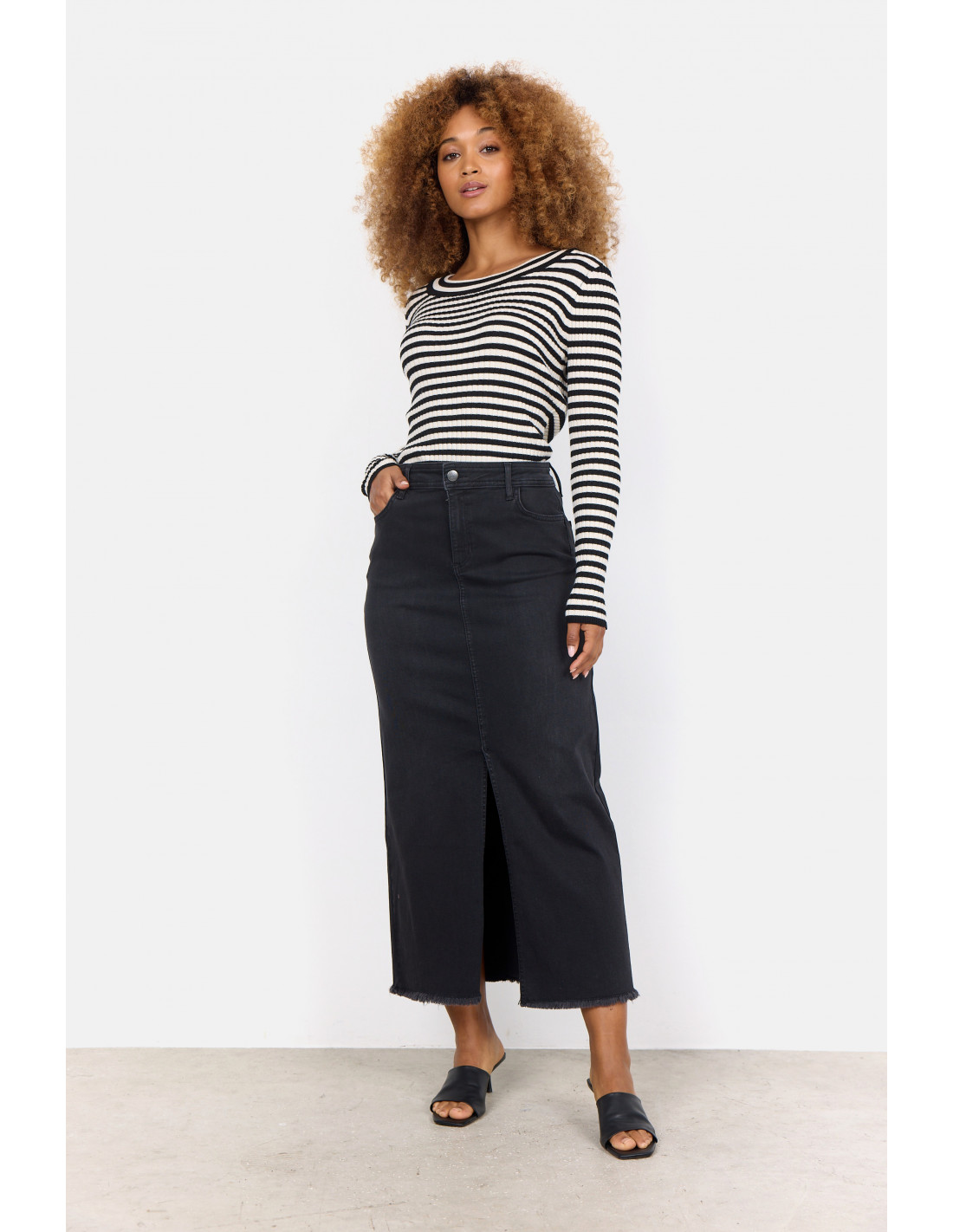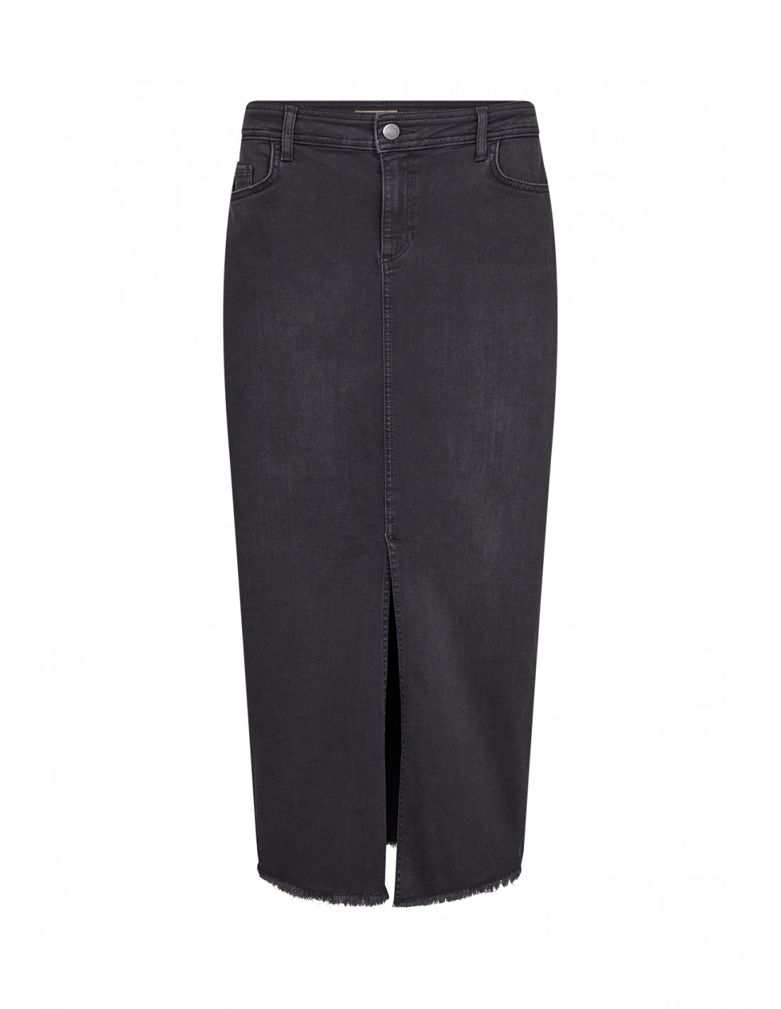 Skjørtet har en høy midje, klassisk femlommers design, en spalt foran og en rå kant nederst, for et litt røffere utseende..