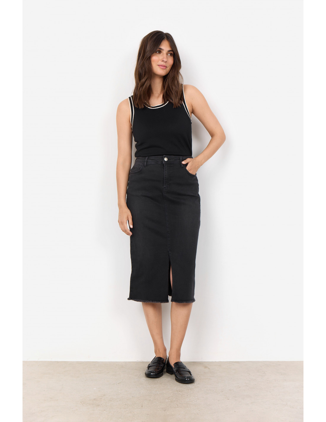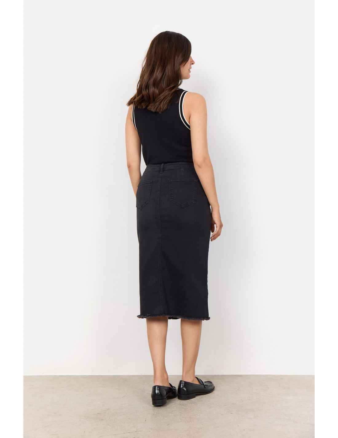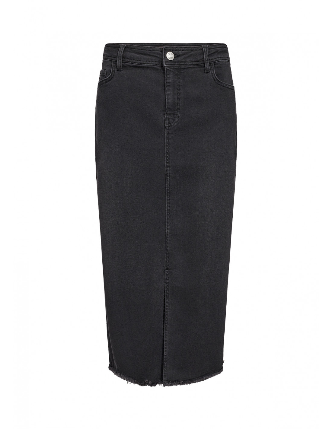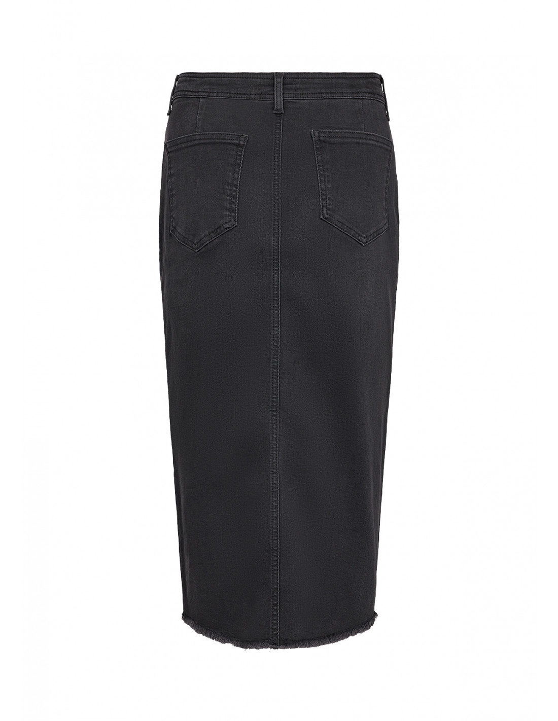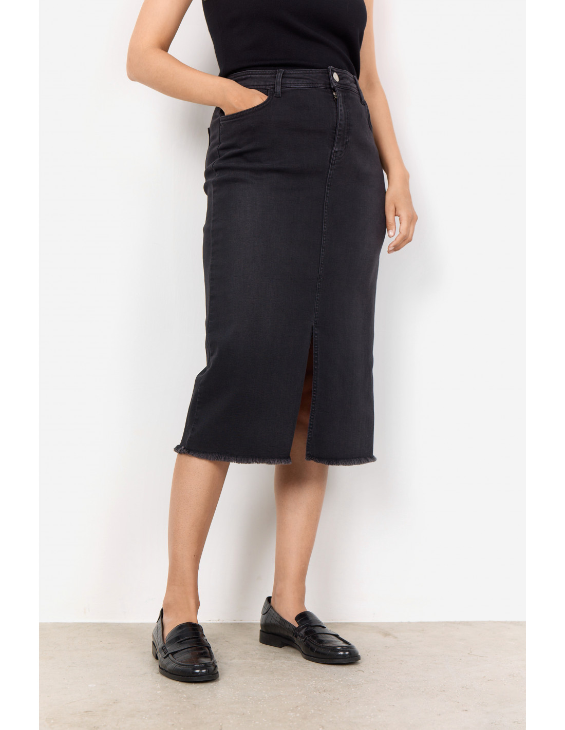 SC-KIMBERLY 29 er et allsidig denimskjørt laget av en komfortabel blanding av 81 % bomull, 17 % polyester og 2 % elastan. Skjørtet har et klassisk design med fem lommer, en knappelukking med glidelåsgylf og en frynsete kant som gir en moderne kant til den knelange silhuetten. Dette skjørtet er ideelt for ulike anledninger, og passer uanstrengt sammen med både figursydde topper og løse bluser, og gir et tidløst grunnlag for ensembler året rundt.