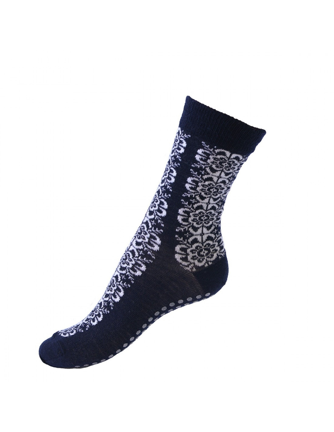 Glattstrikkete ullsokker med blomstermønster og praktiske antiskli-knotter i sålen. Sokken inneholder 5% kashmir som gjør den ekstra myk og behagelig på. Strikkløs topp som letter blodsirkulasjonen i beina. Merinoull transporterer svette og fukt, og er naturlig lukthemmende.