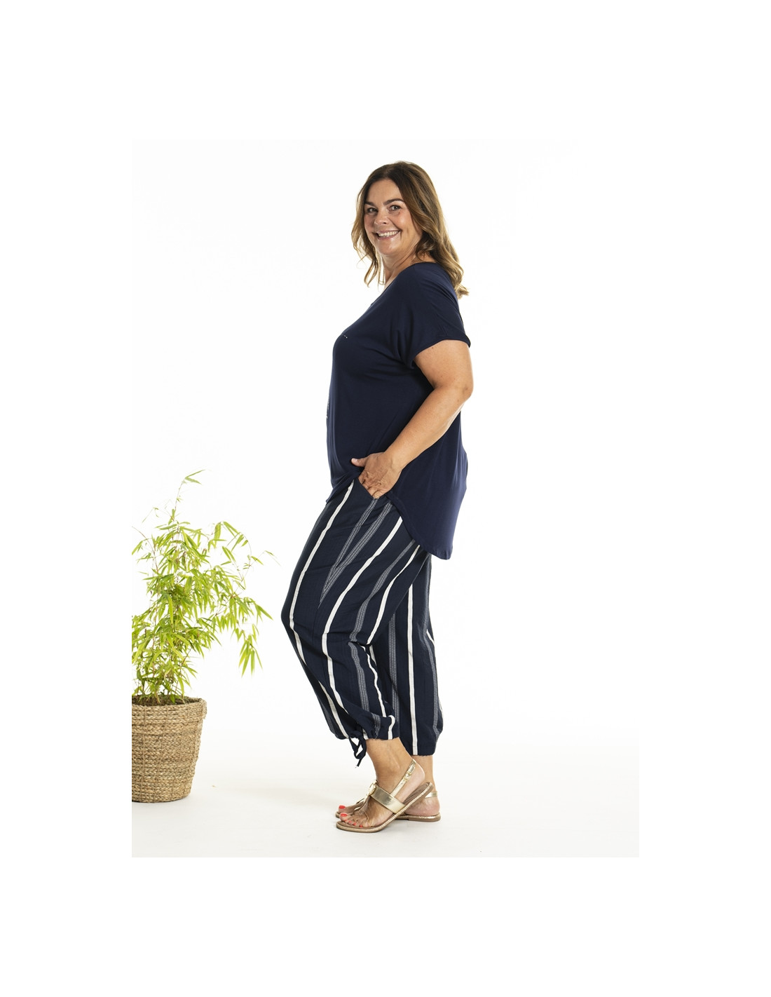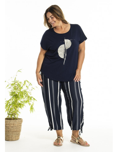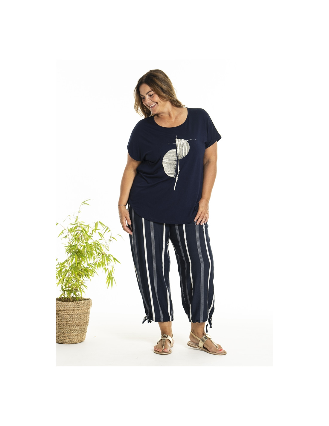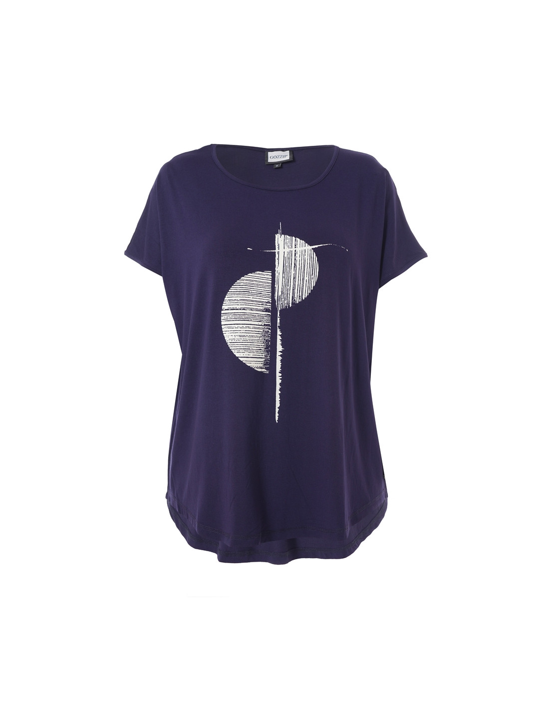 Stilig jersey-t-skjorte i viskose-elastan-blanding. T-skjorten er ensfarget med et dekorativt fronttrykk, tilgjengelig i flere farger. Modellen har en O-hals, korte drop-shouldermer og en avrundet nederkant, litt lengre bak.