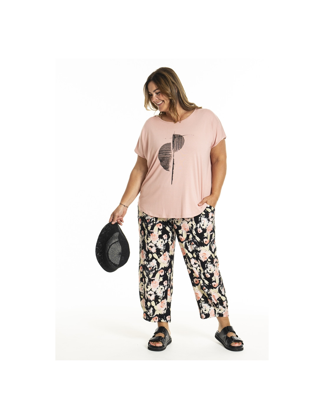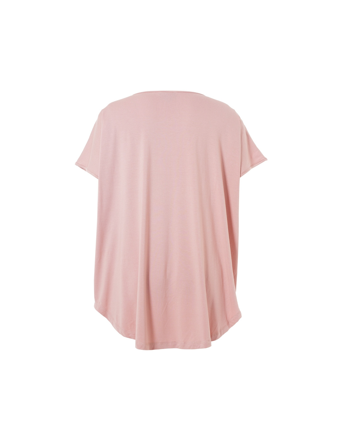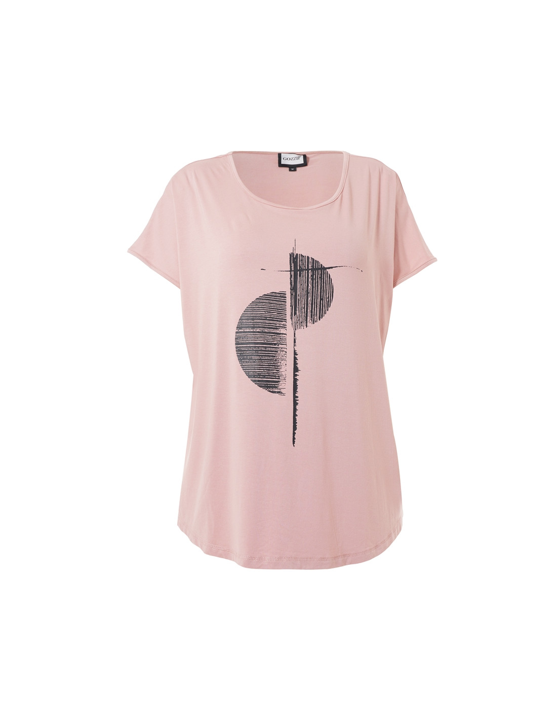 Stilig jersey-t-skjorte i viskose-elastan-blanding. T-skjorten er ensfarget med et dekorativt fronttrykk, tilgjengelig i flere farger. Modellen har en O-hals, korte drop-shouldermer og en avrundet nederkant, litt lengre bak.