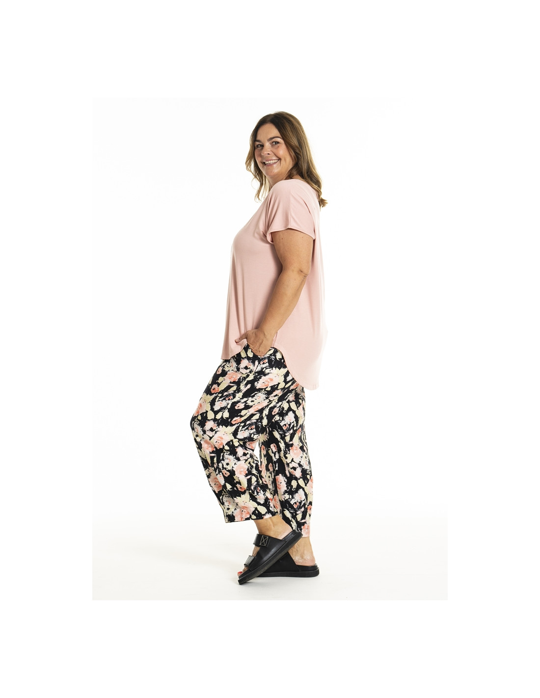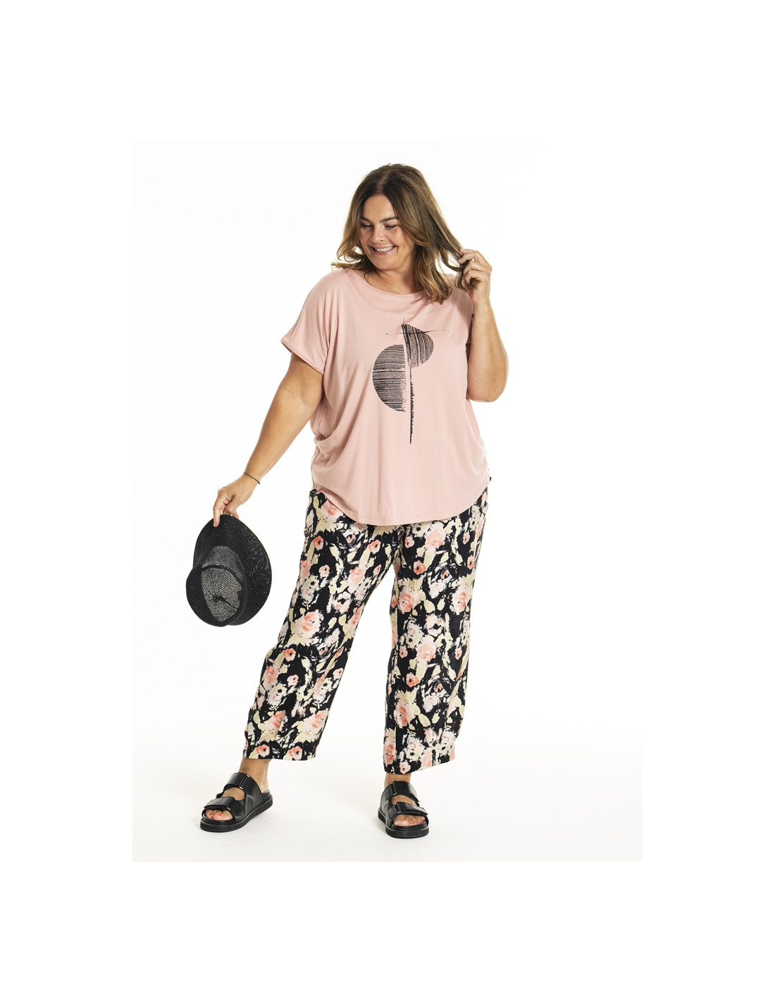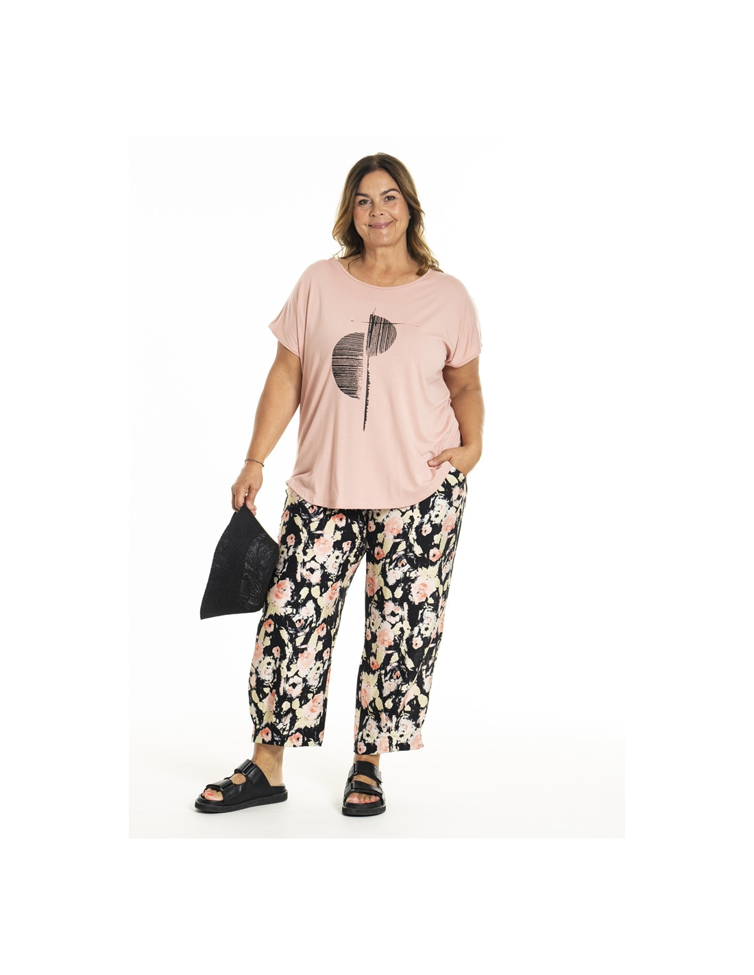 Stilig jersey-t-skjorte i viskose-elastan-blanding. T-skjorten er ensfarget med et dekorativt fronttrykk, tilgjengelig i flere farger. Modellen har en O-hals, korte drop-shouldermer og en avrundet nederkant, litt lengre bak.