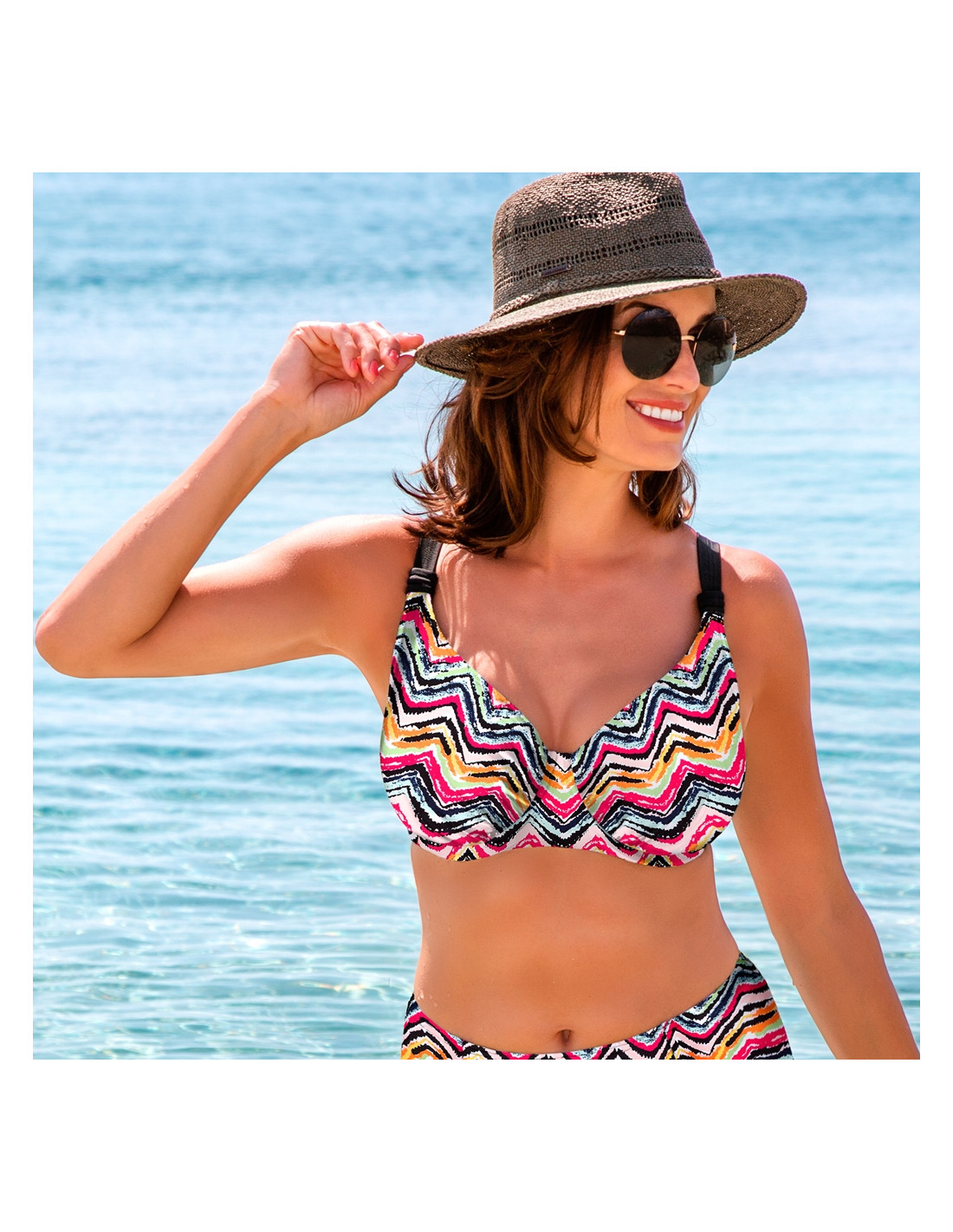 Bikinitopp med hel kopp. Bøyle og helforet. Ingen polstring. Stretch stoff. Hurtigtørkende. Justerbare stropper.Bred stropp for bedre passform. Bøyle. Låselukking. Håndvask