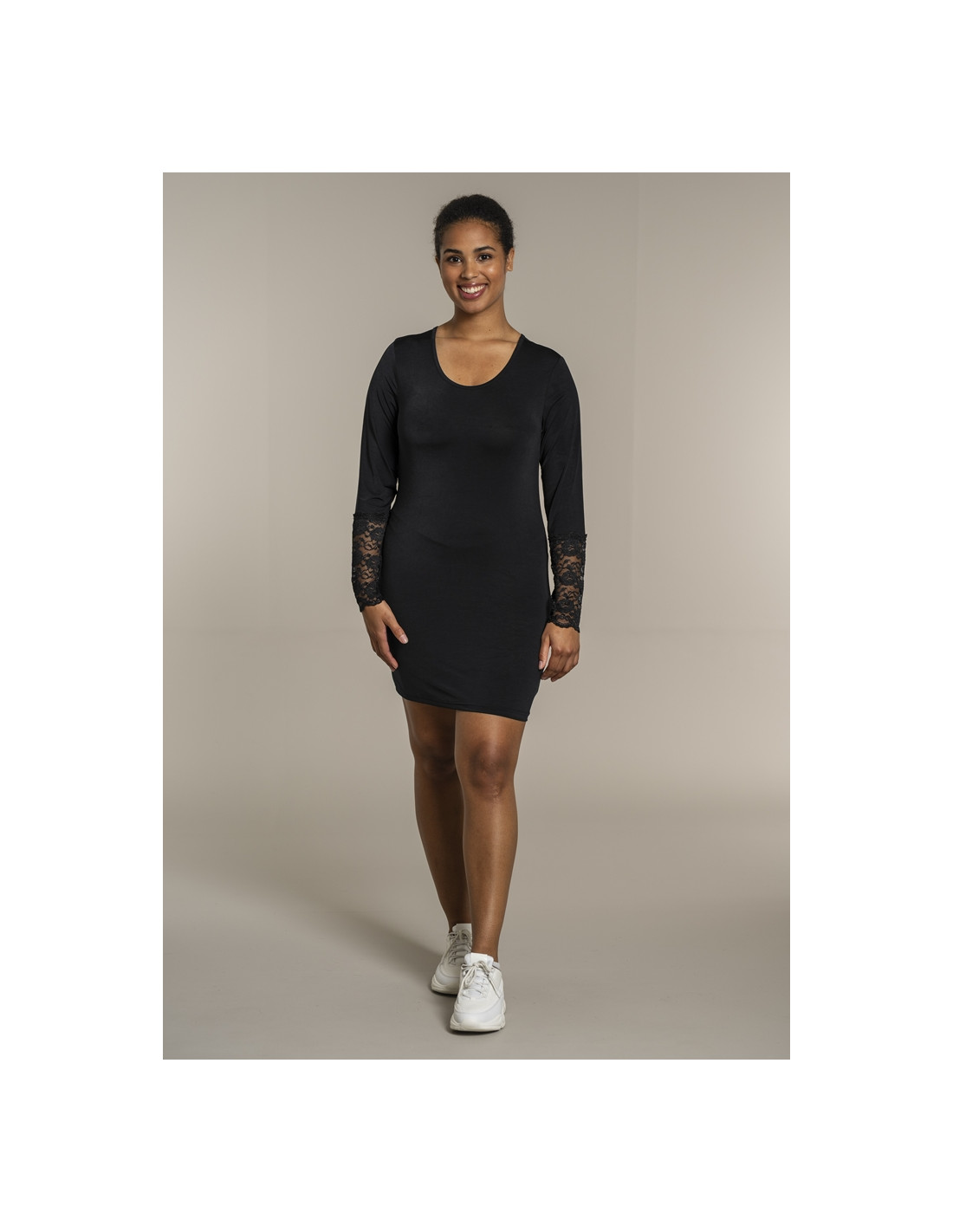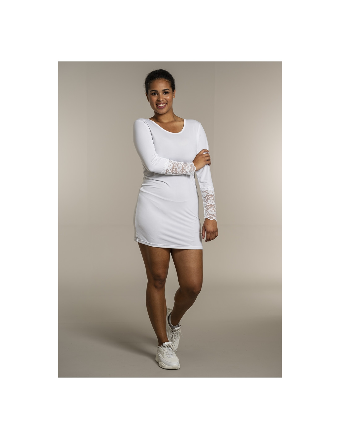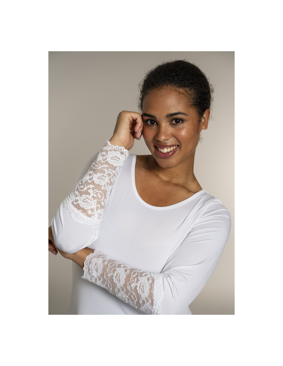 Ensfarget lang t-skjorte i polyesterblanding. Lange ermer med elastiske blondedetaljer. Rund hals.