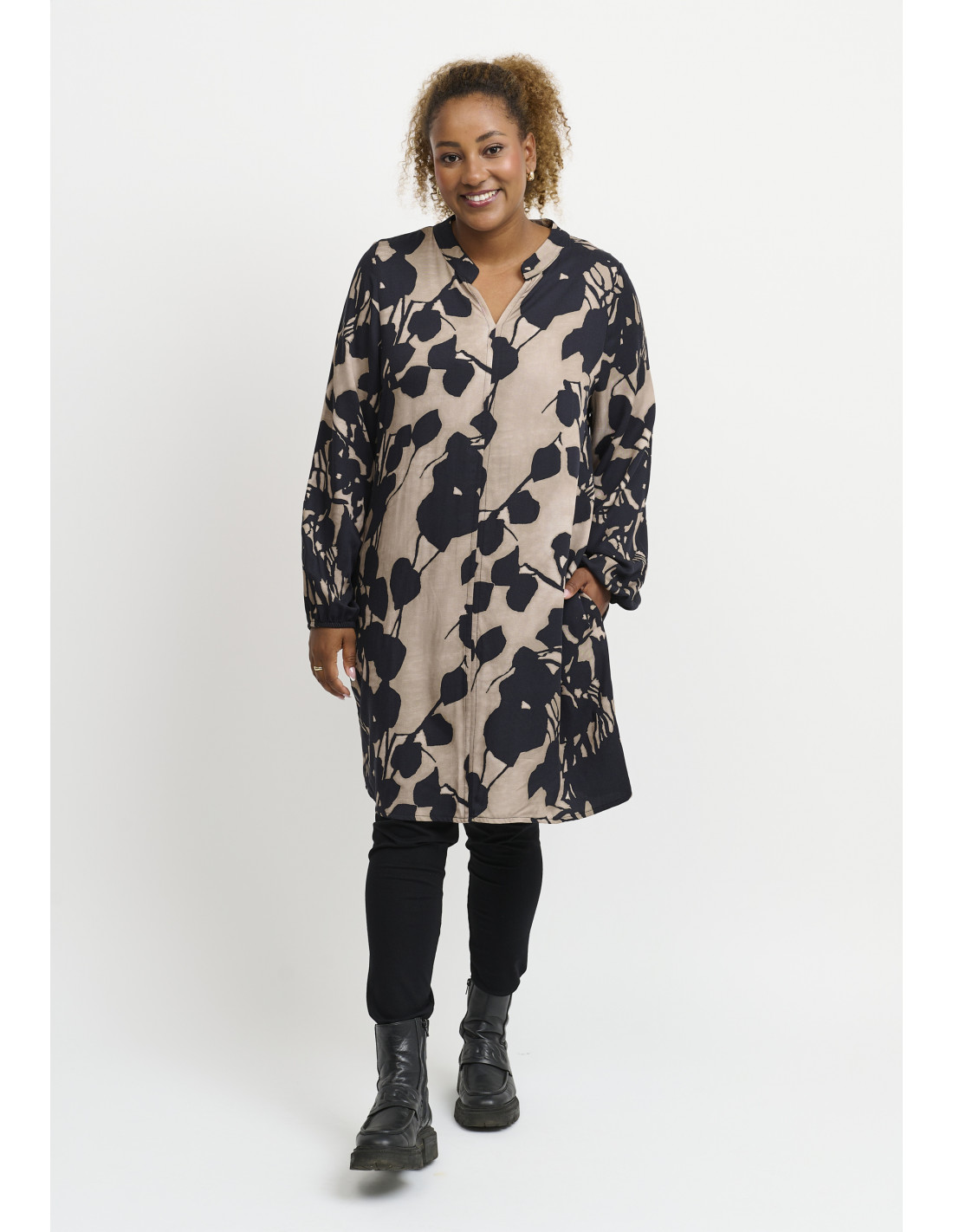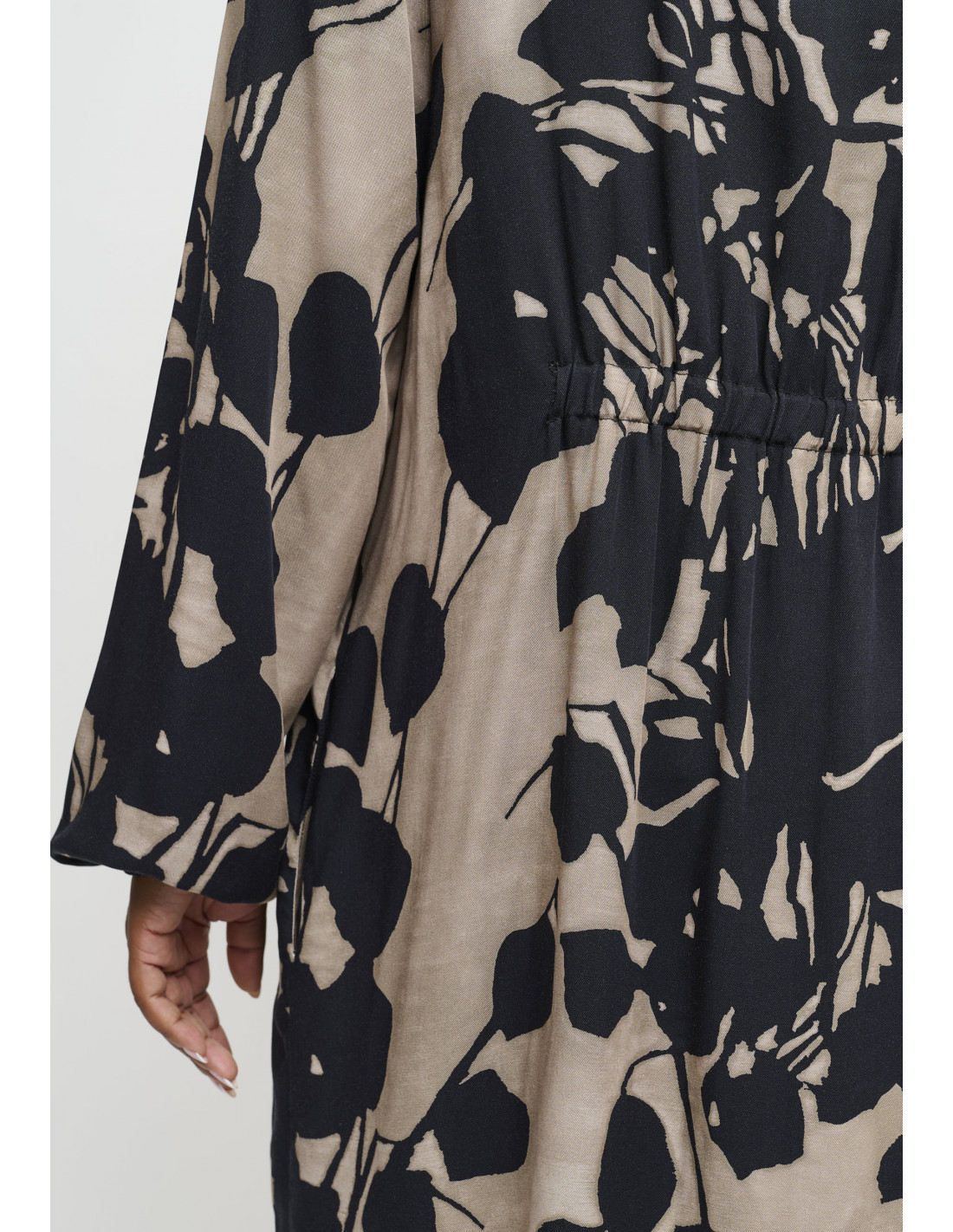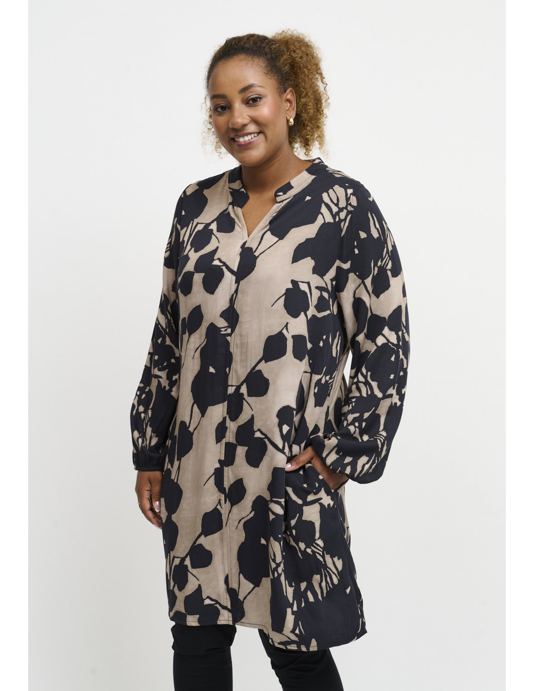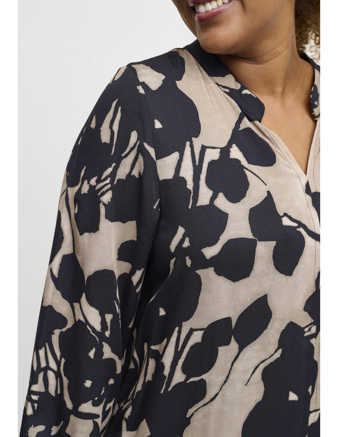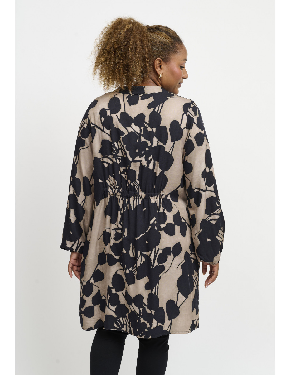 En myk og feminin tunika med et stort dekorativt blomstertrykk i svarte og rosa toner på en lys bakgrunn. Den A-formede silhuetten gir et vakkert fall og en komfortabel passform, mens det rene viskosestoffet sikrer en pustende og lett følelse. Med et enkelt design, rund hals, lange ermer og generøs lengde, er den perfekt å kombinere med leggings eller smale bukser.