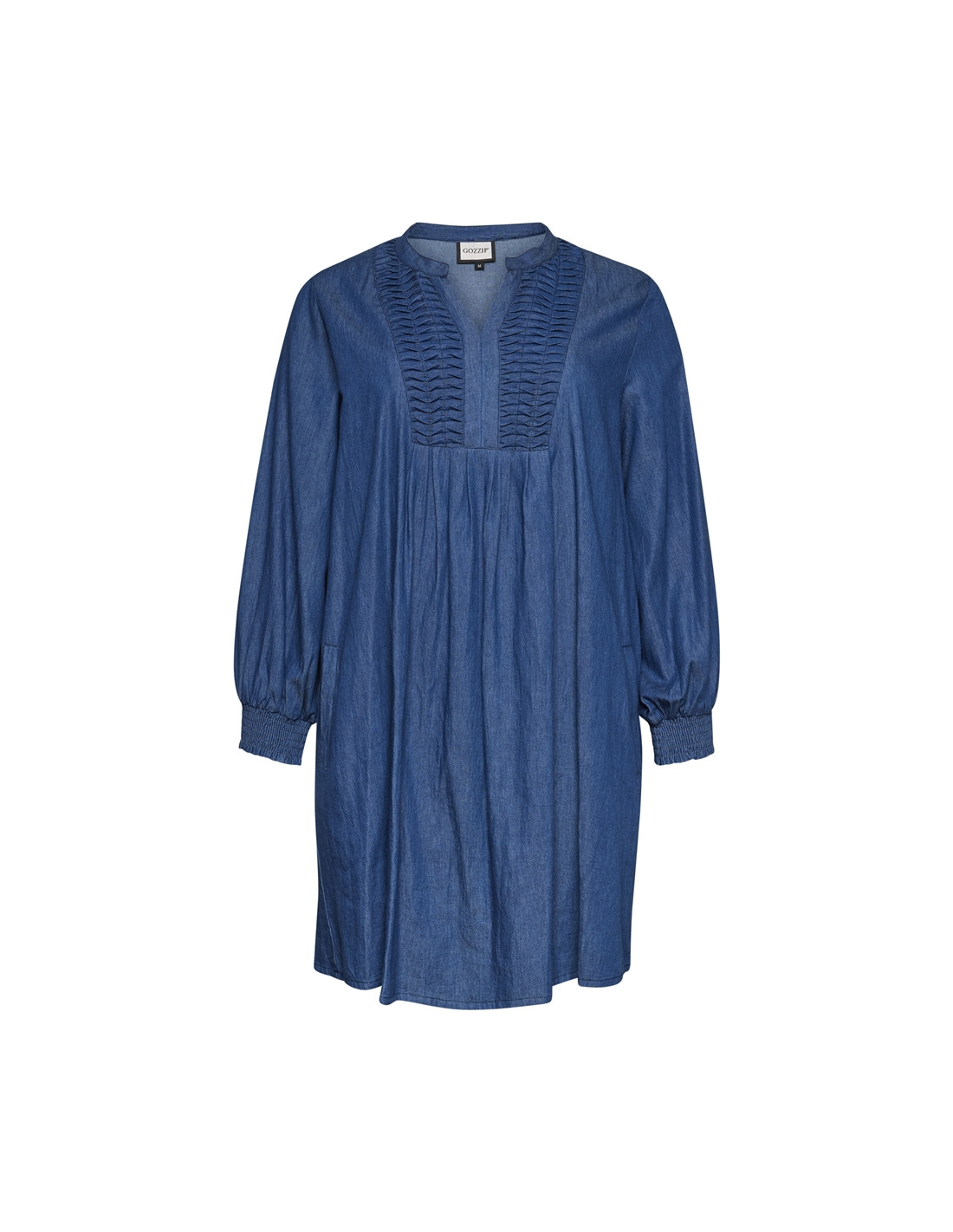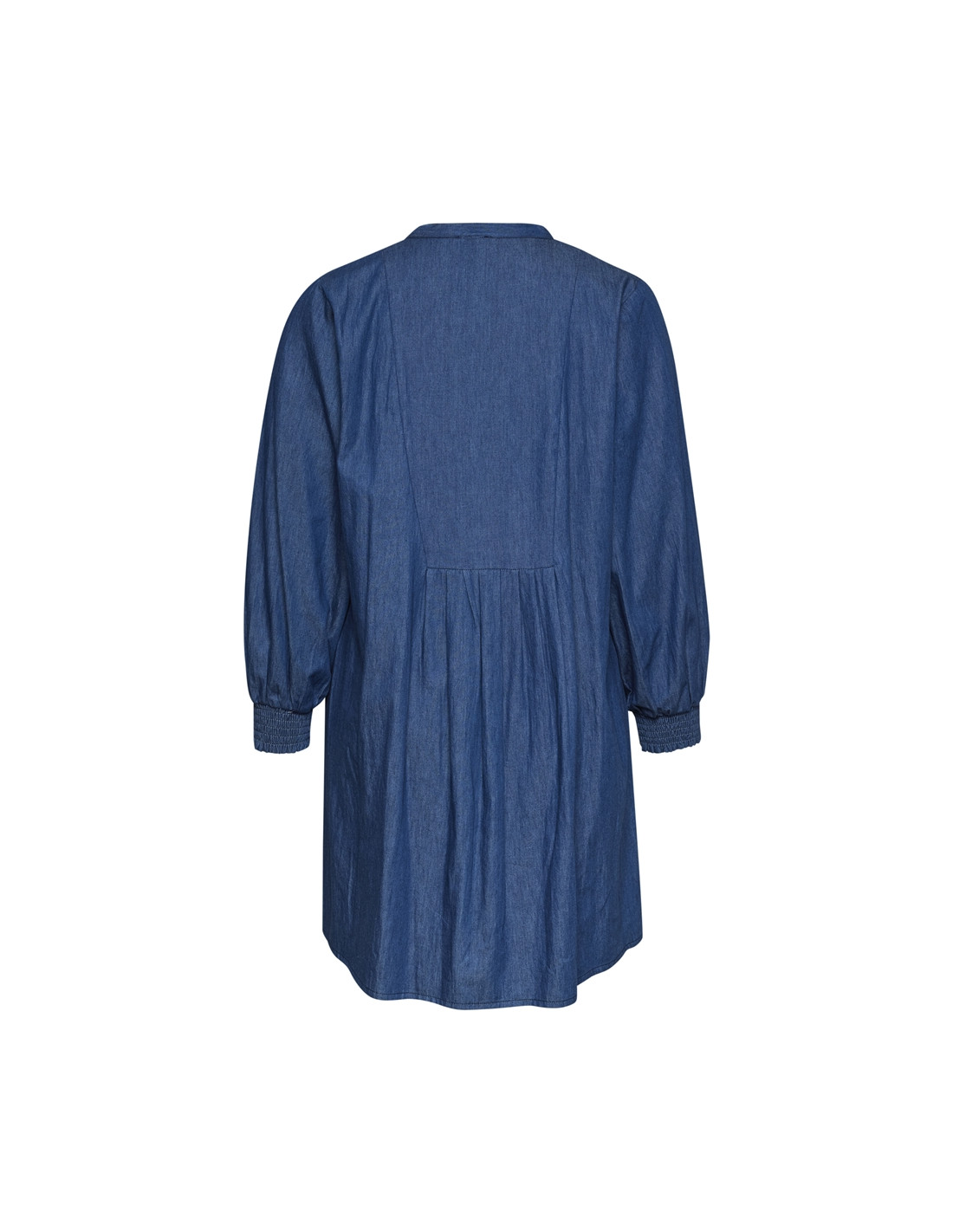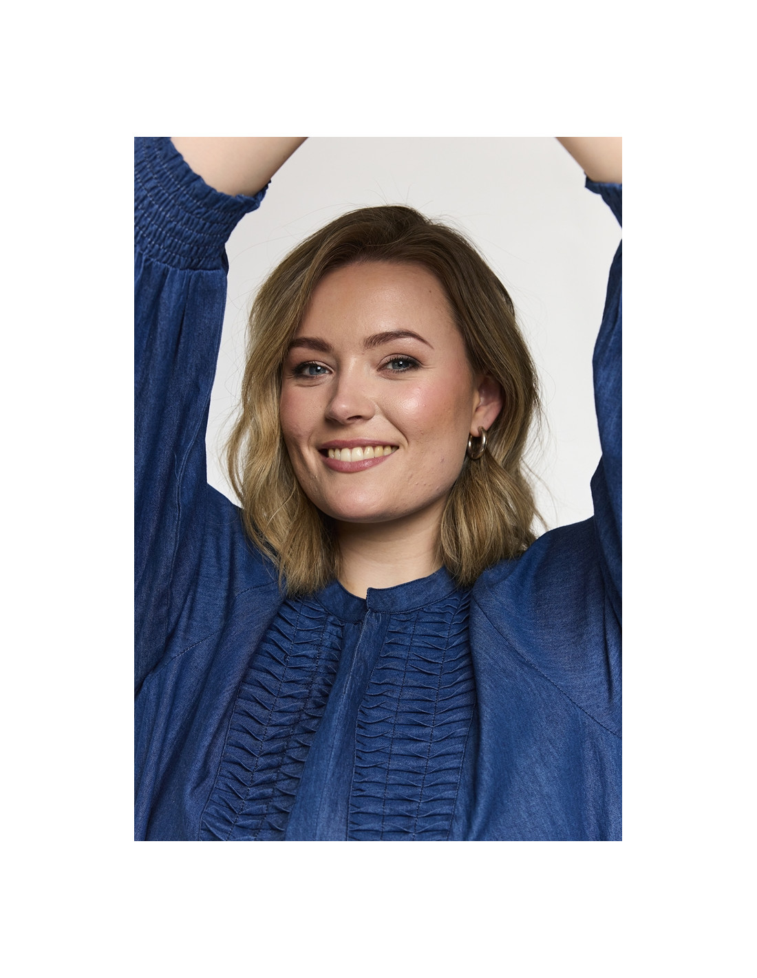 En lett og romslig denimtunika i 100 % bomull med en avslappet, myk silhuett. Modellen har V-hals med lett overlapp, lange ermer og innfelt rynking under bystelinjen, noe som gir en feminin og komfortabel passform. Den kortere tunikalengden gjør modellen perfekt til leggings eller skinny jeans.