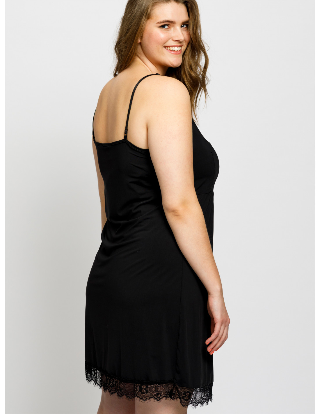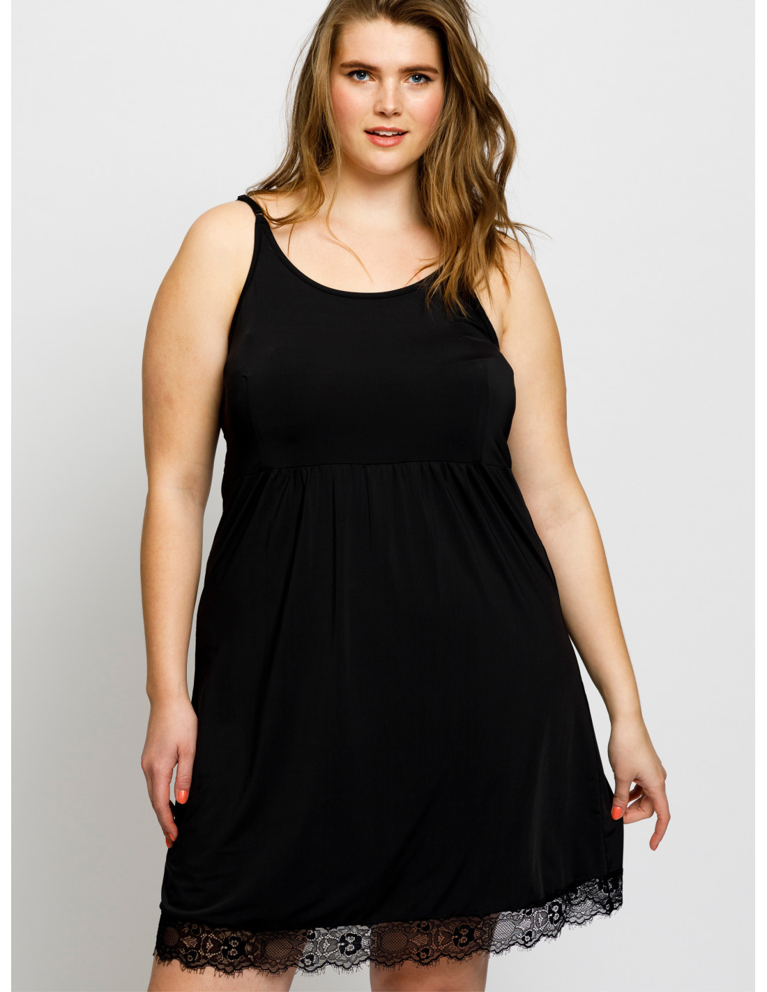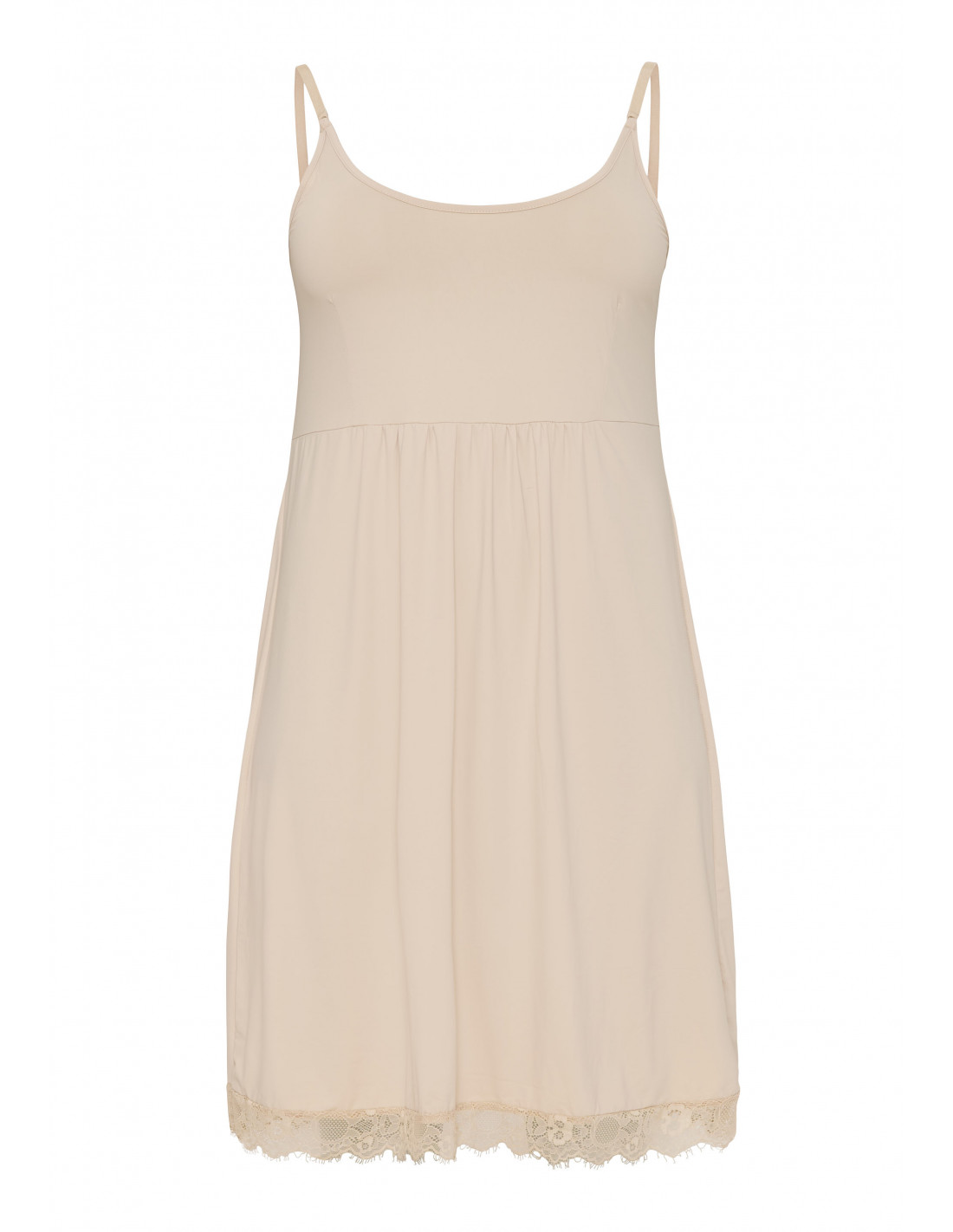 Lett vevd underskjørt med justerbare spaghettistropper, rynkedetaljer, rund utringning og en vakker blondekant.