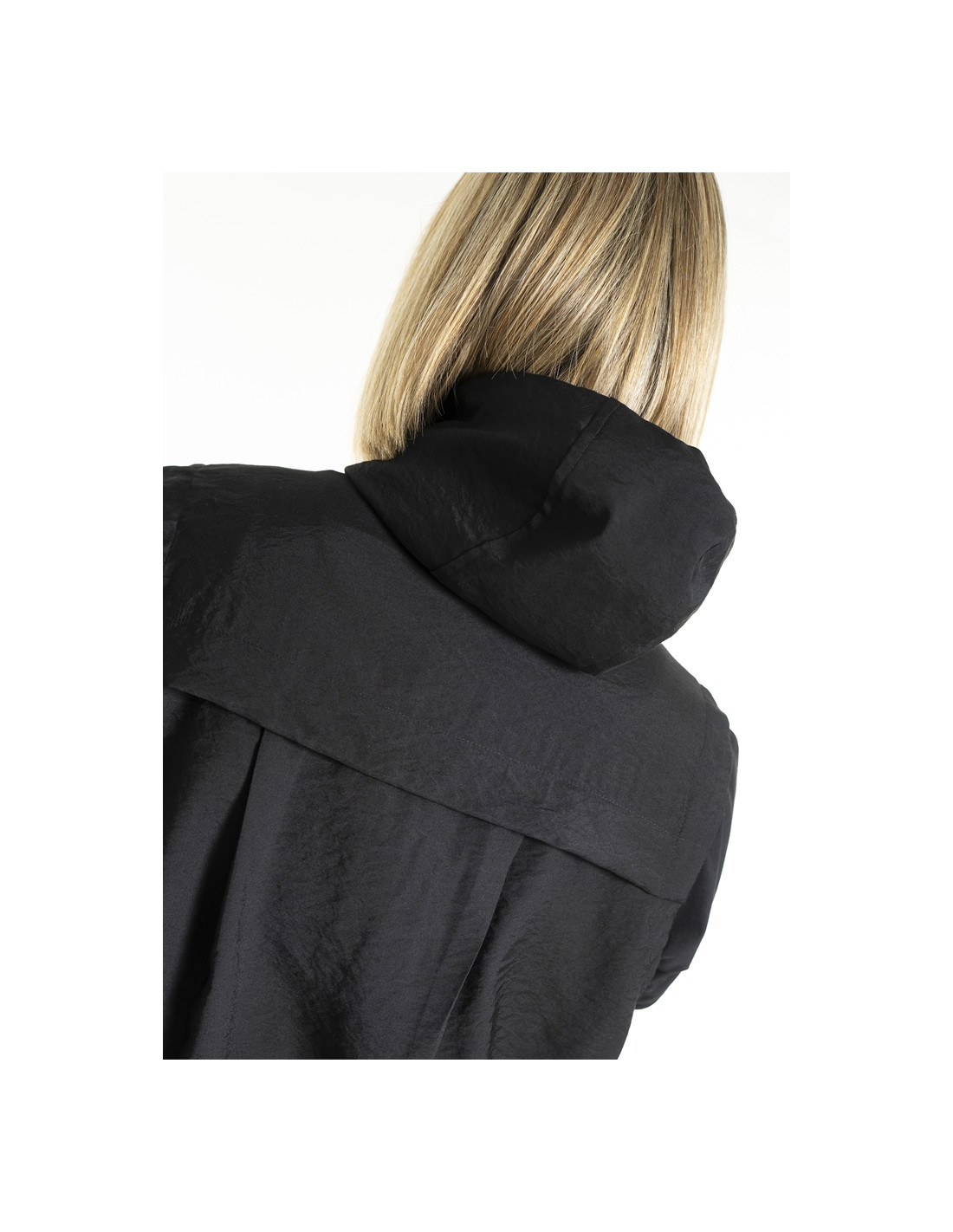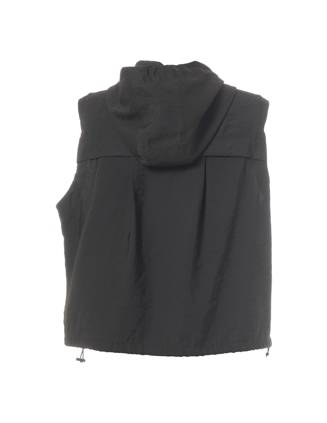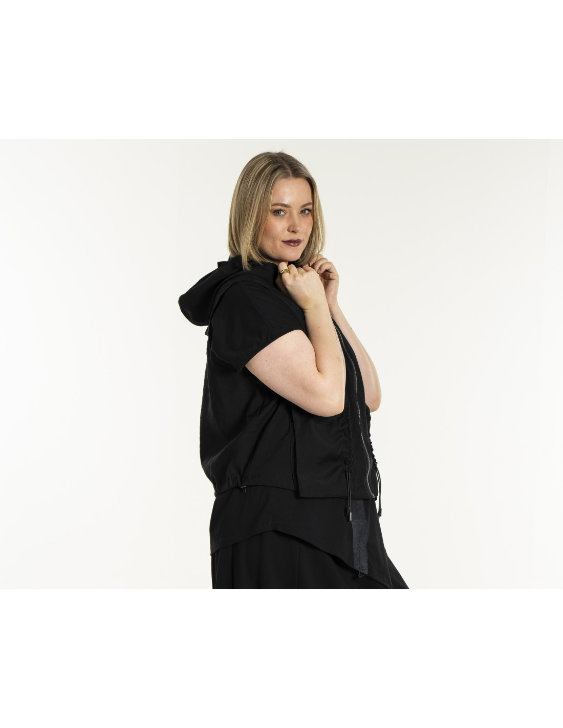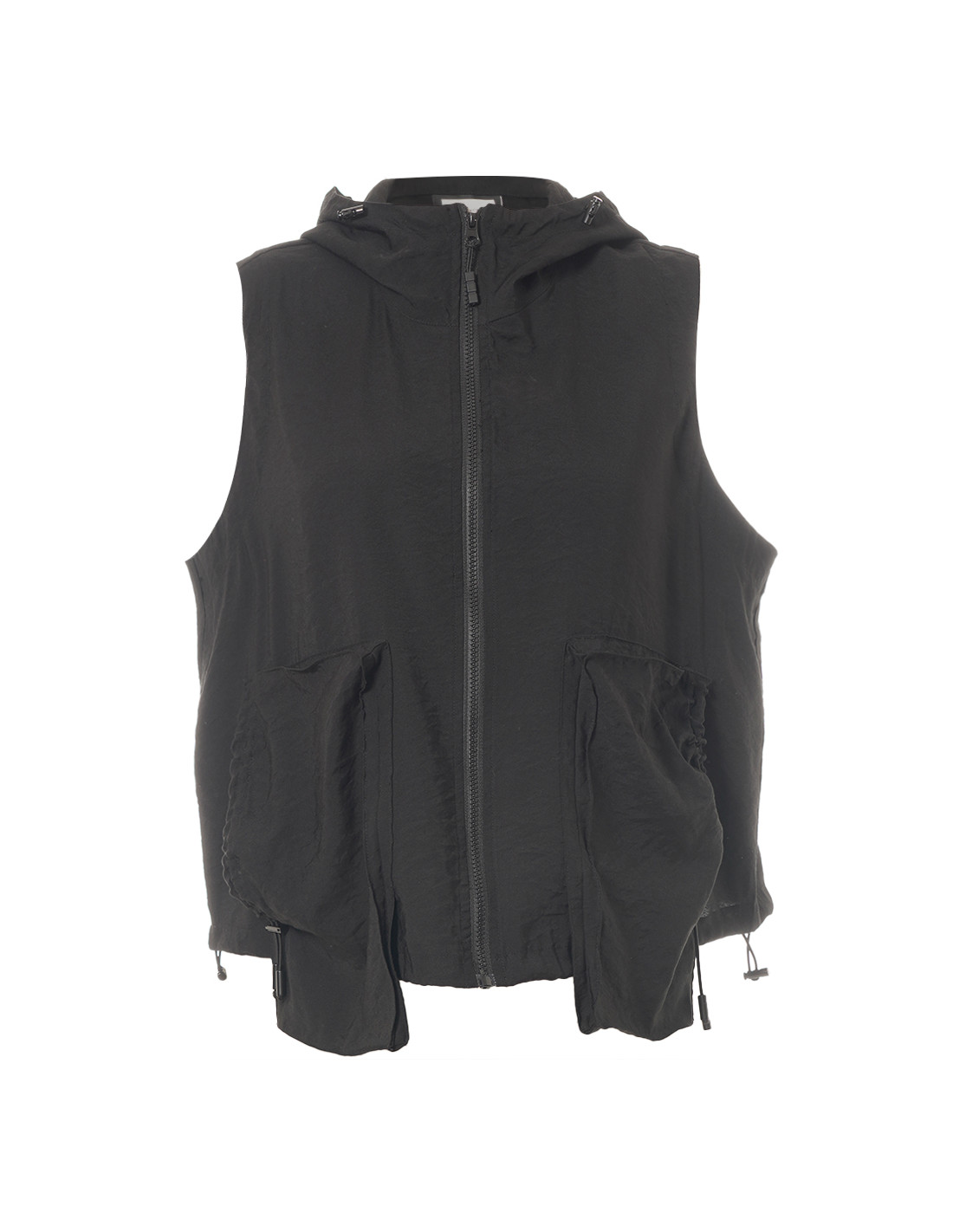 Stilig vest i svart bomull-nylonkvalitet med lett glans. Modellen har hette med snøring, hel glidelås foran og store, påsydde lommer med rynket effekt. Det er snøring på begge sider nederst for å justere passformen.